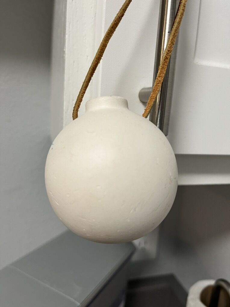 This 2.5 hand-painted Southwest Pueblo ornament and potpourri holder features a sphere shape with a diameter of 2 3/8. It is designed in a traditional Pueblo dwelling pattern with a multicolor finish, reflecting a Southwestern style. The pottery item is handmade in the United States and comes with a leather hanging strap for easy display. Perfect for adding a touch of Native American theme to your home decor, this unique piece is ideal for holding potpourri or serving as an ornament.