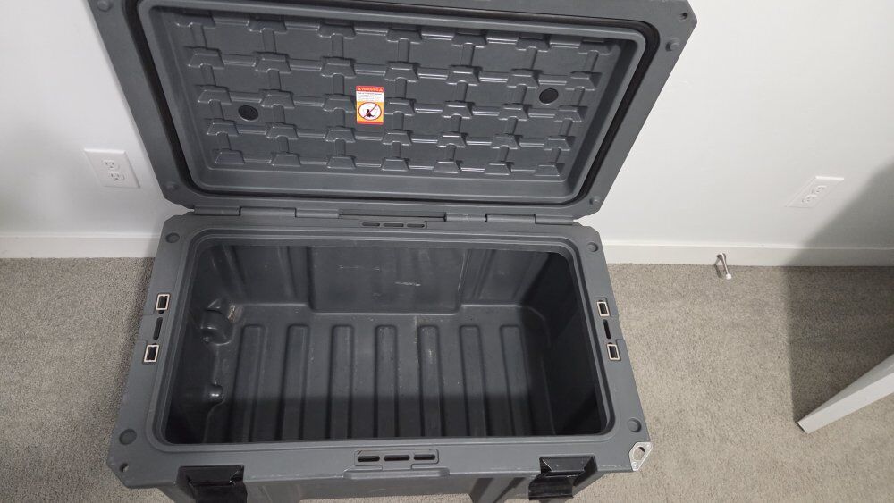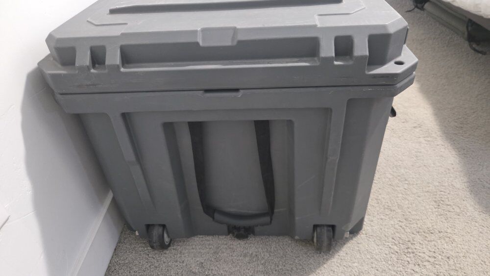 VenmoGrey storage box for gear. Heavy duty with metal clasps, bottle opener, holes for locks, rubber gasket, and wheels to pick up and pull. $150 or best offer.