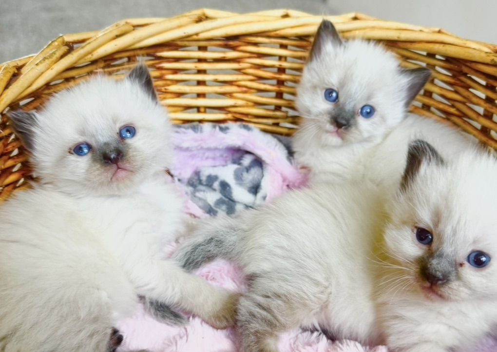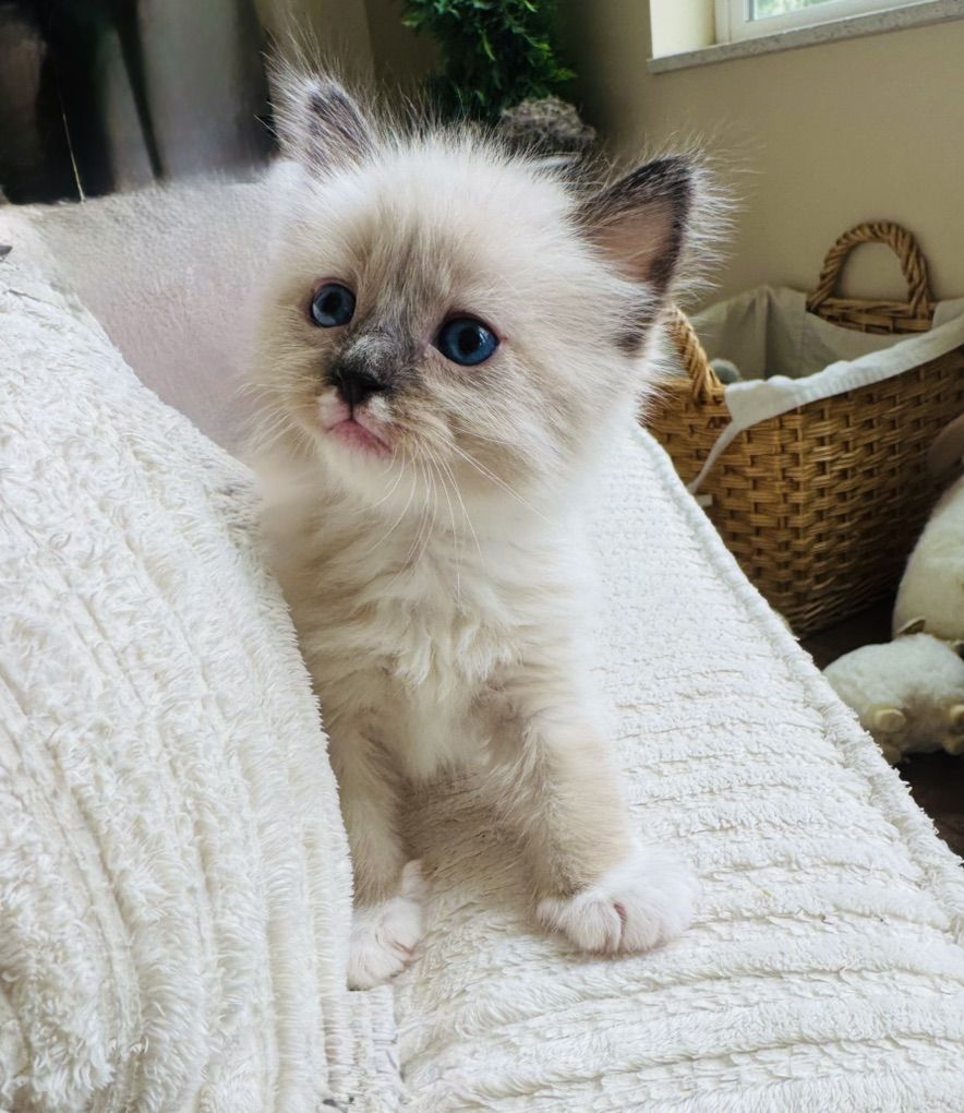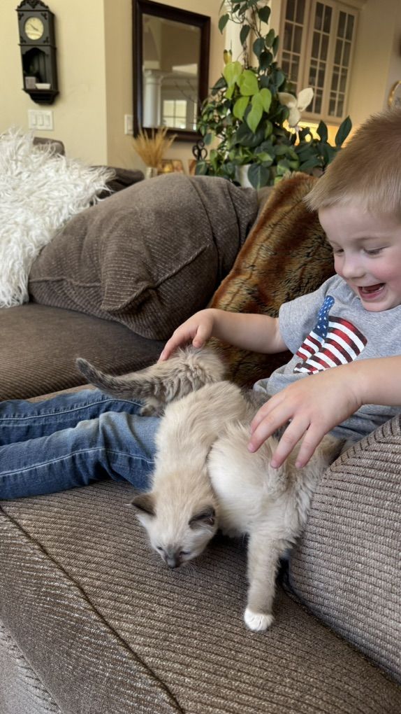 Our Pevency is nearly 4 years old (pictured 1st-6th). He's a Purebred, Blue Mitted Lynx with Mink Fur--both of his parents are TICA Registered & Papered and he produces STUNNING kittens w/ super fluffy coats with BEAUTIFUL BRILLIANT BLUE EYES Always with th famous loyal PUPPY DOG FLOP on your lap temperament (all of what Ragdolls are known for).