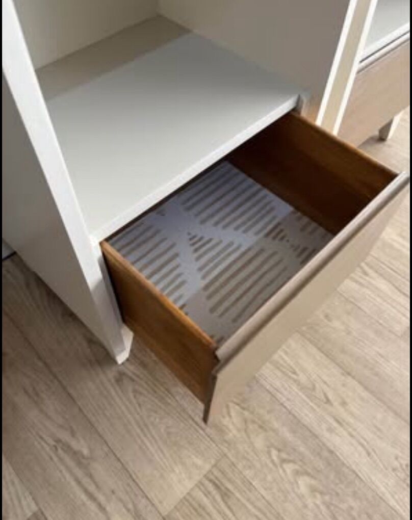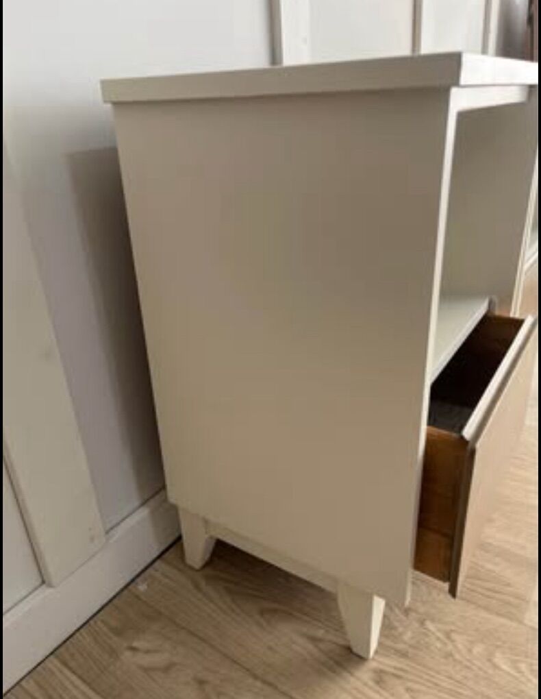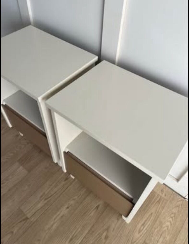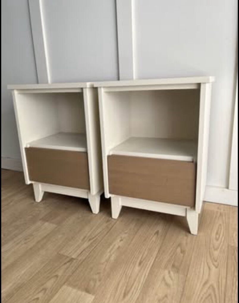 VenmoSet of Beautiful Like New Mid Century Nightstands These were made in the 1960’s. Refinished with creamy white enamel paint. Drawer grind sanded down and stained with tan wash. Dovetail drawers pull well and lined with new vinyl liner.
