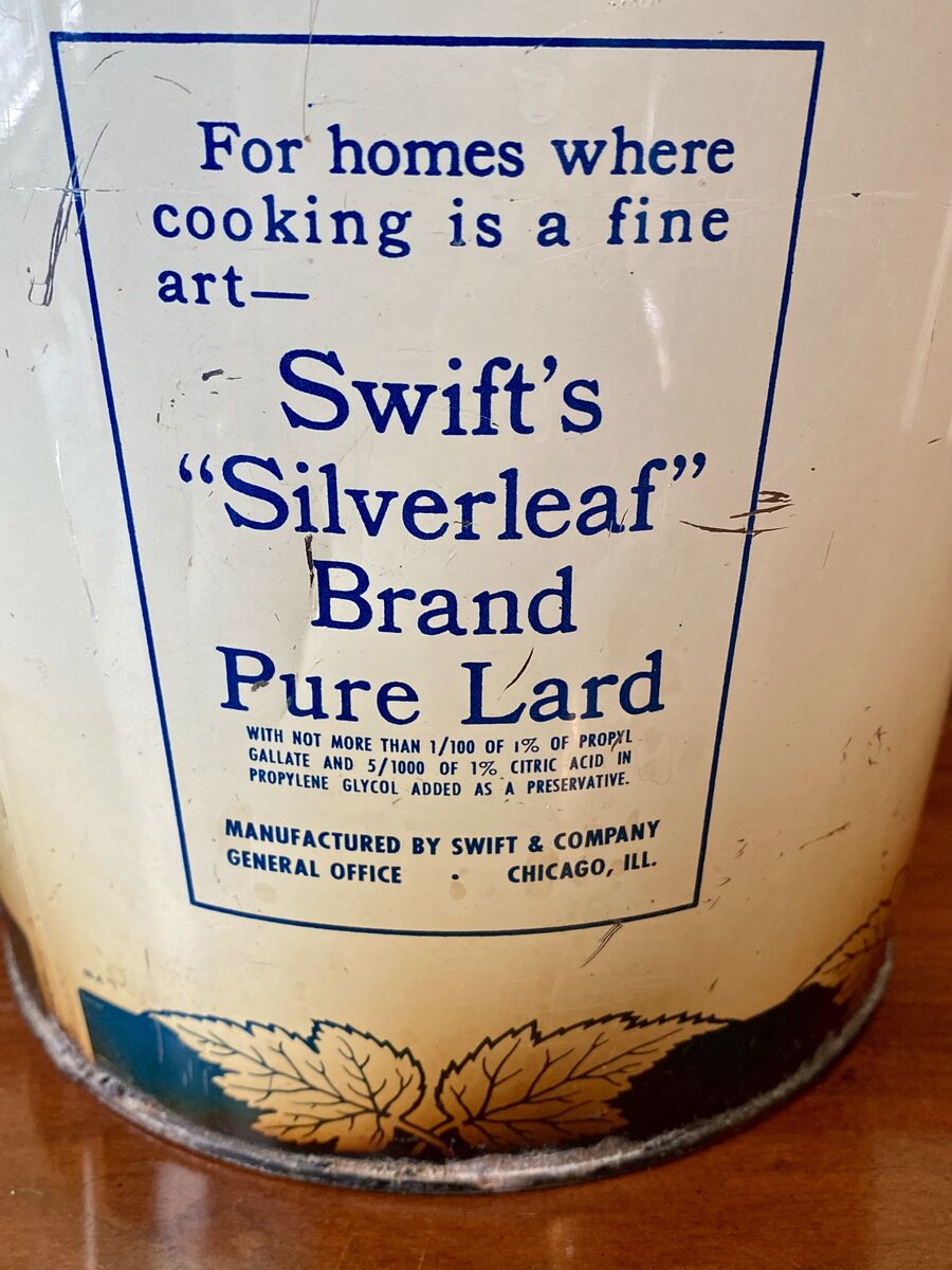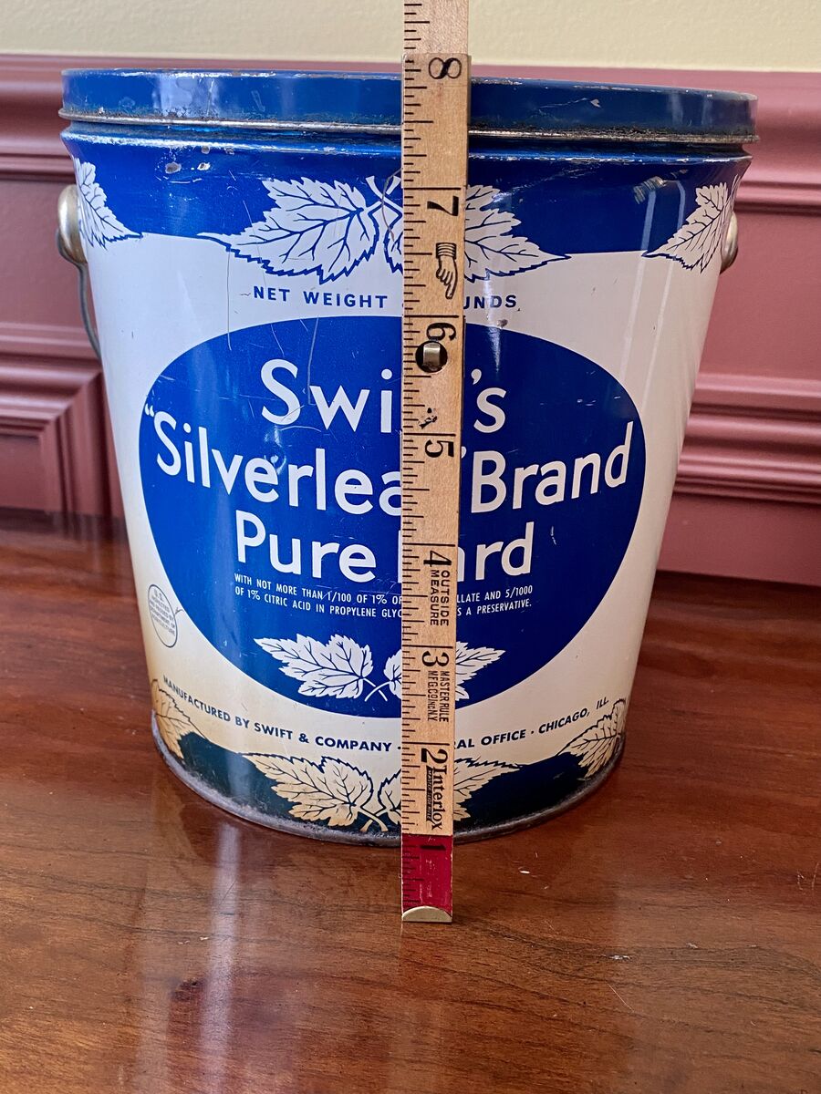 RARE- Swifts Silverleaf Brand Pure Lard - Vintage Advertising Large Tin Bucket in Blue N White - C PIX. These are awesome in Decorating! Quite the conversation starter. I believe that's it's from the 1920s. I also have the yellow and blue one in a separate listing.
