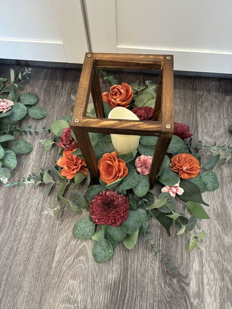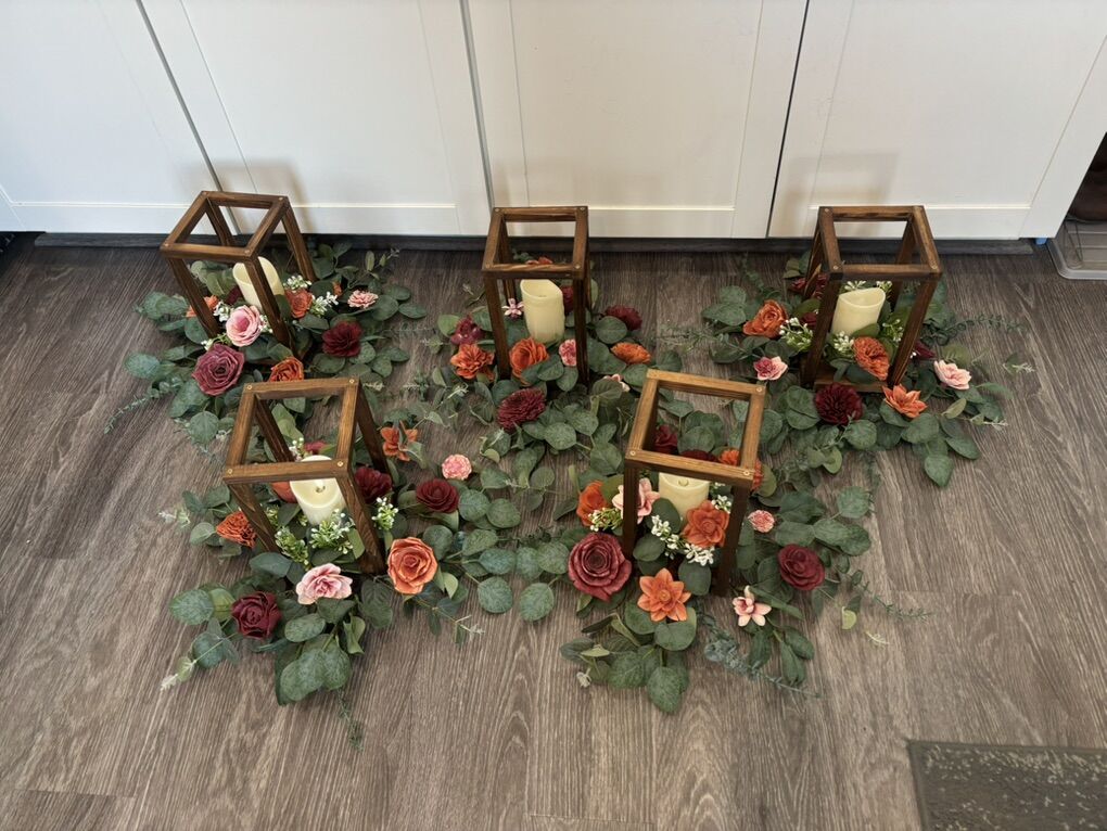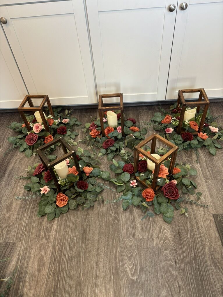 Venmo10 available, $30 each or rent for $15 each. Each centerpiece comes with 10” lantern , led candle, artificial greenery and wood flowers in burgundy, orange and pink.