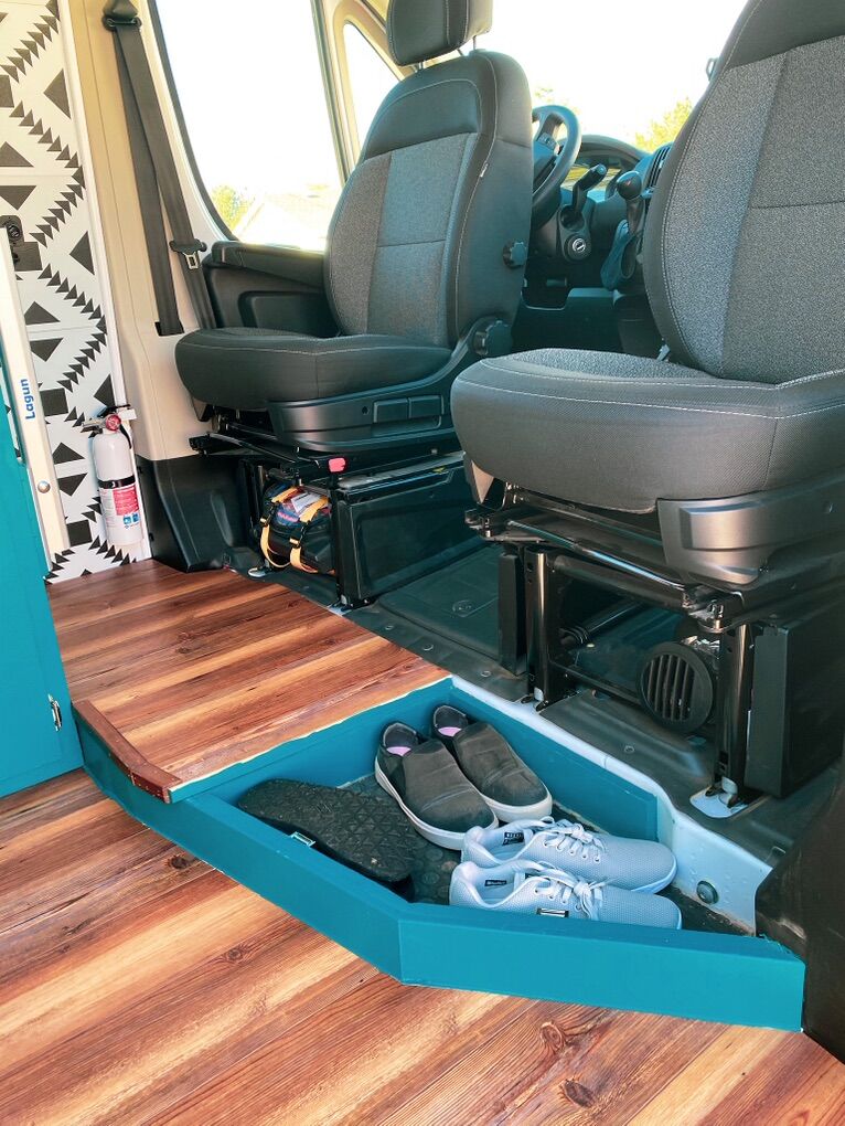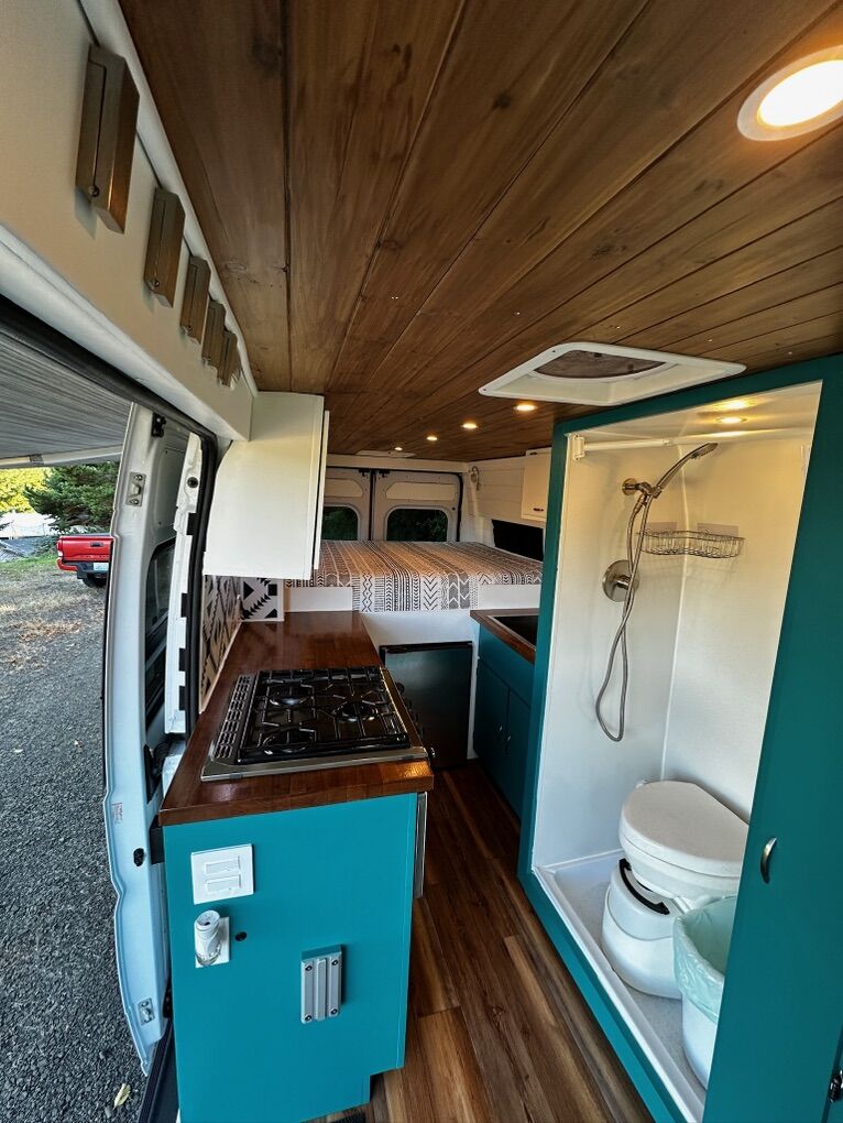 Fixed queen bed (70″ wide) with garage storage underneath 24×32″ shower with fold-out curtain for additional space Nature’s Head composting toilet, deep cleaned and new pee jug Both front seats swivel Lagun table mount Cedar plank ceiling Full-height pantry with mirror