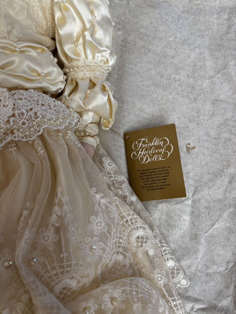 The Bebe Bru Victorian Bride Doll from Franklin Mint Heirloom Gorgeous Doll. Great condition. Certificate of authenticity attached and original literature. Beautiful satin and lace dress with hanging pearls. Comes with floral bouquet and pearl purse. Extremely long veil adorned with ribbons and pearls. Cash only Pick up only - located in Sandy Please text