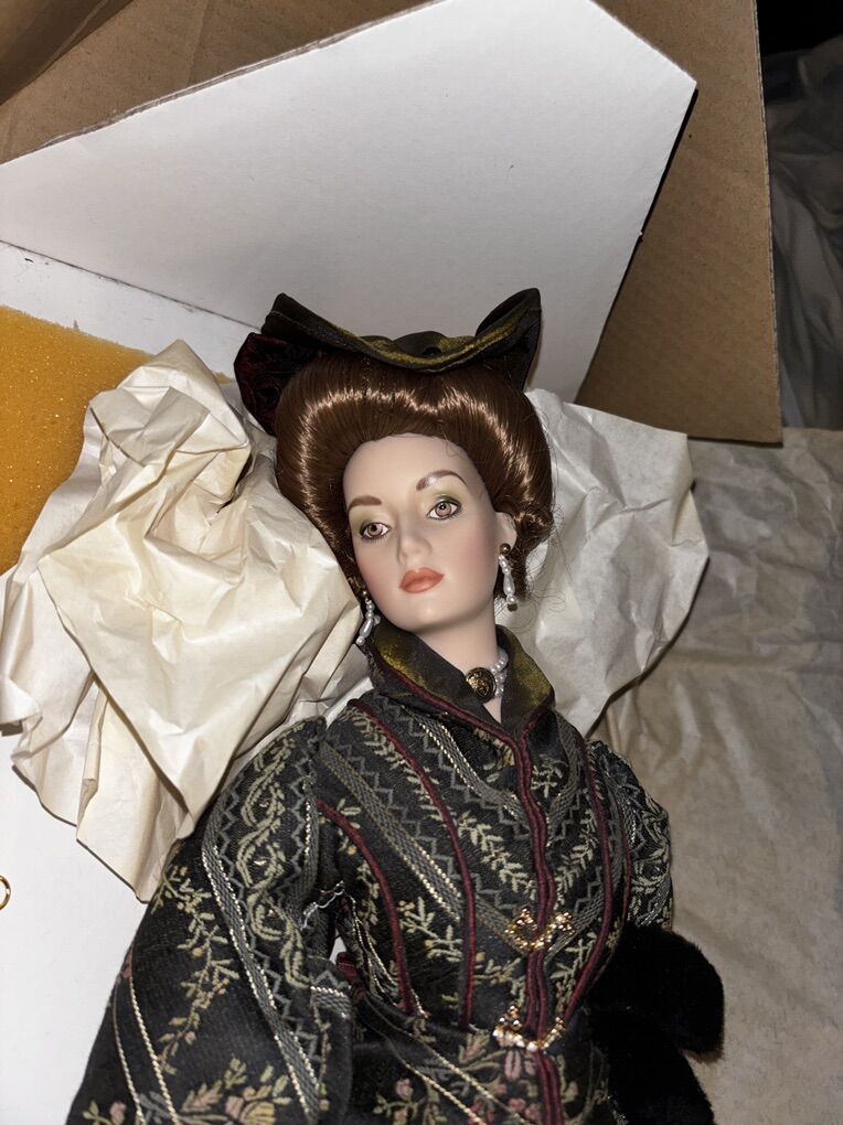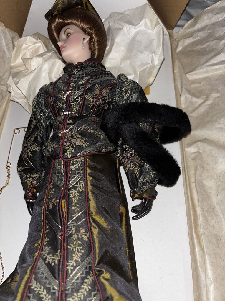 Maker: Franklin Mint (part of their Heirloom collection) Name: Anna, the Gibson Girl, Roman Holiday Material: Porcelain head, hands, and feet Height: Approximately 22-23 inches tall Cash only Pick up only West Jordan Text please