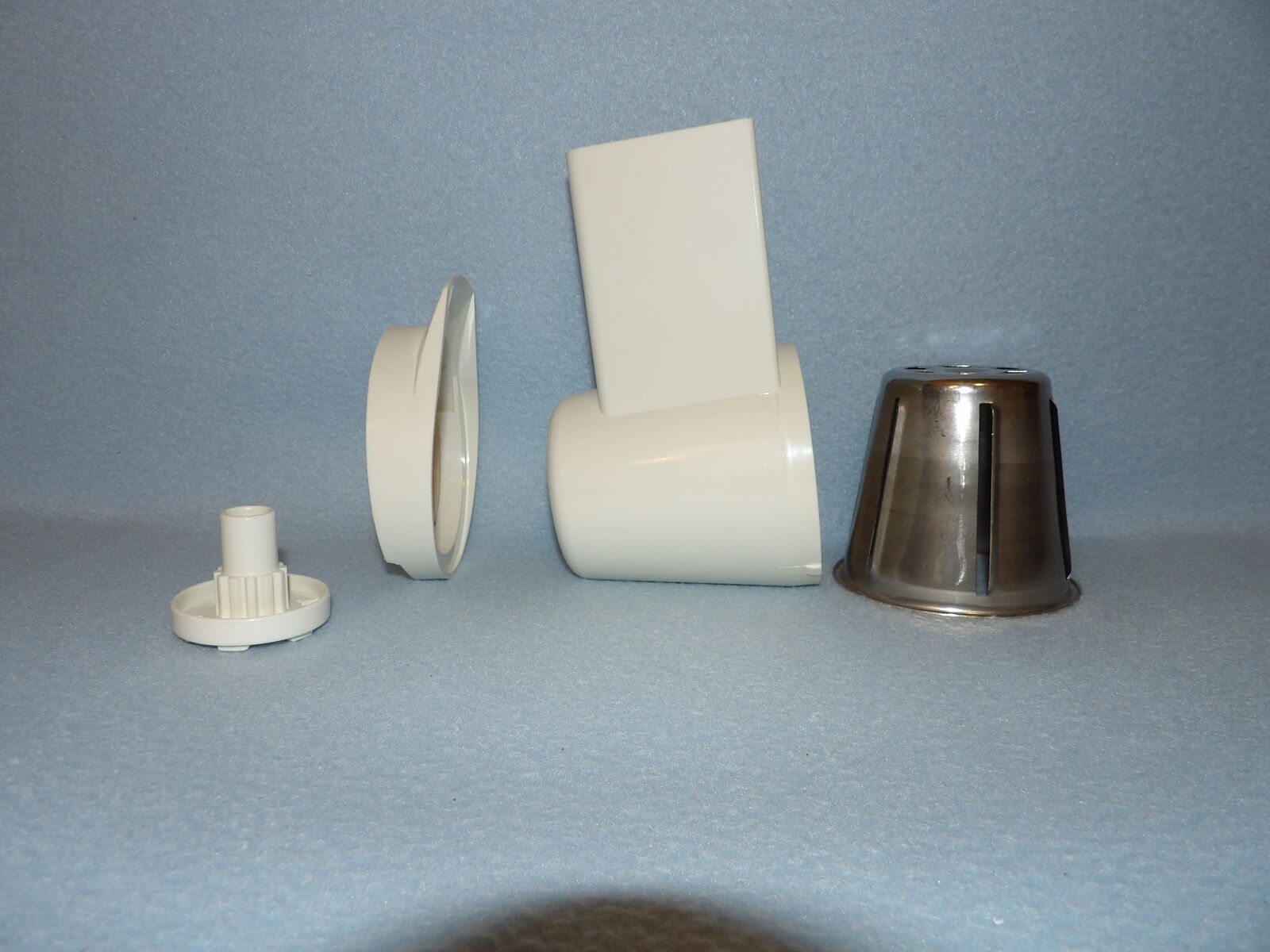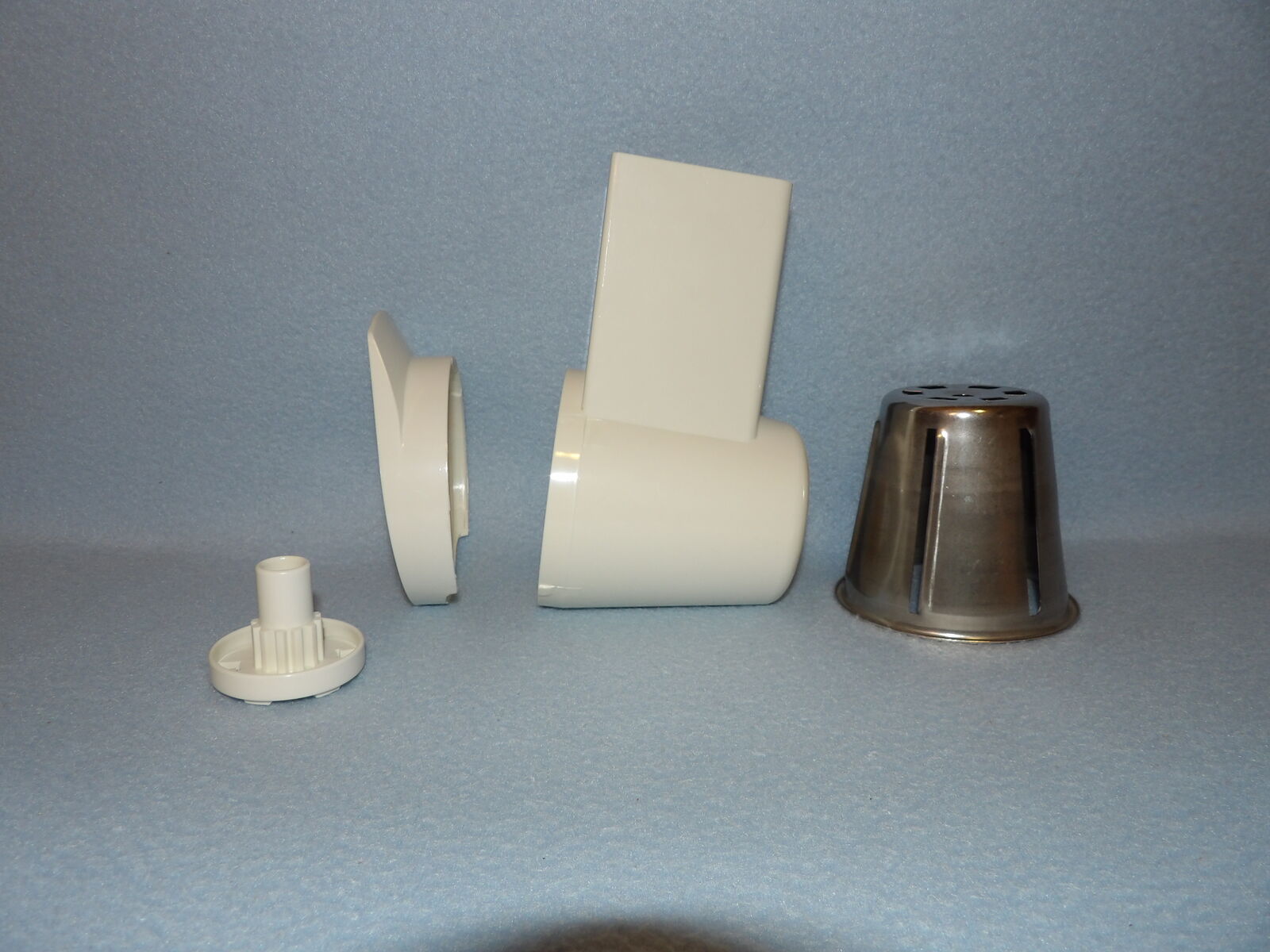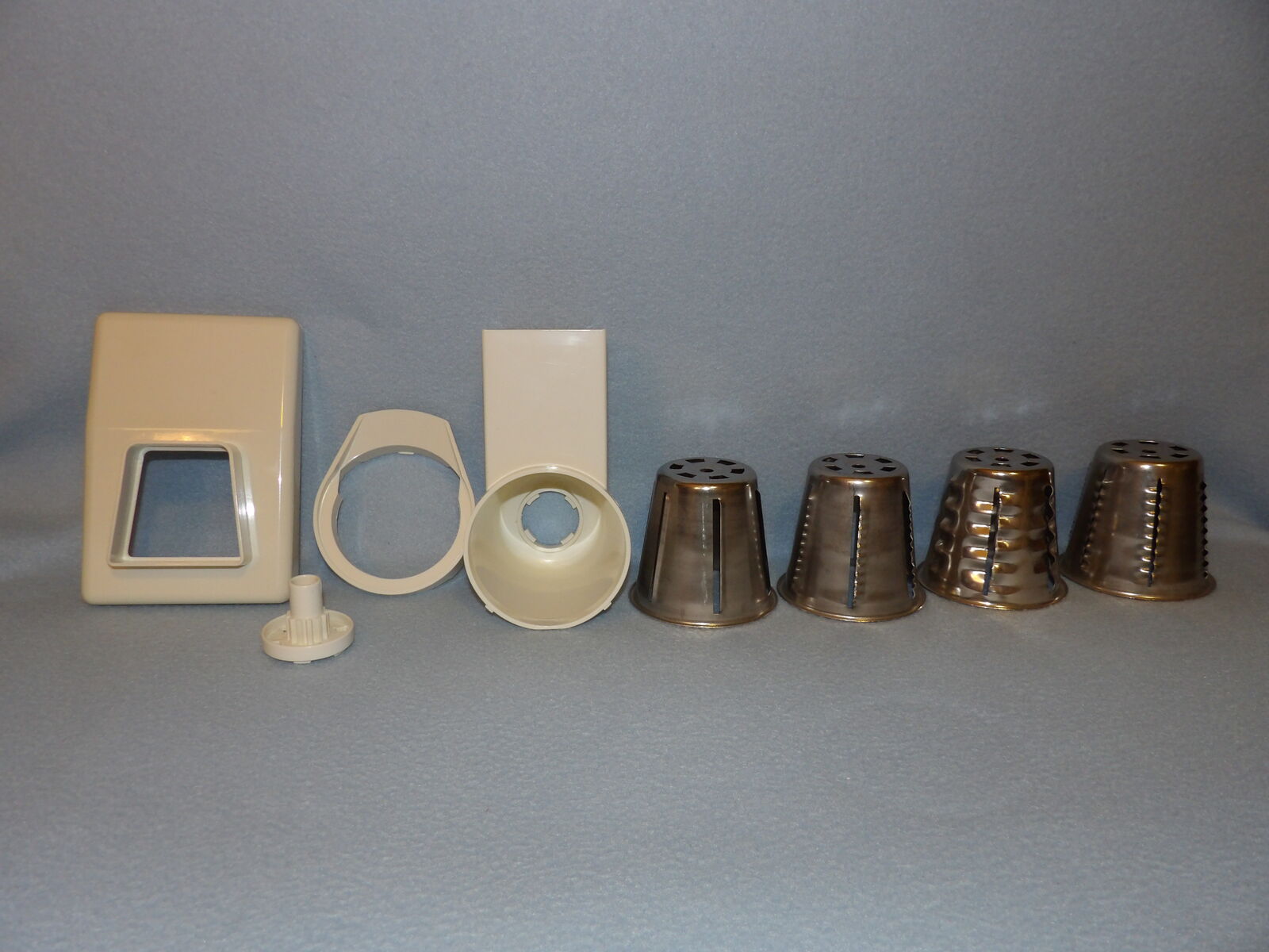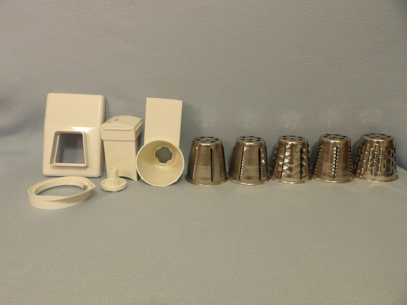 $80 Vegetable Shaft, “O” Cover, Attachment Disk, Food Tray, & 4 Metal Cones (Straight Slicer, Crinkle Cut Slicer, Julien, & Large Grate)