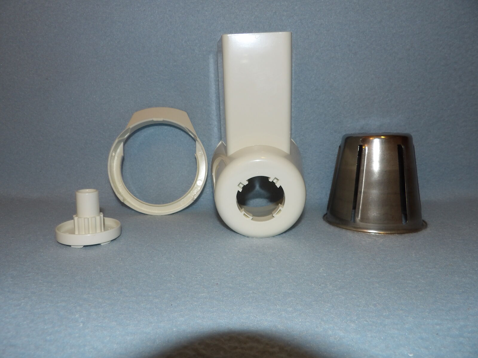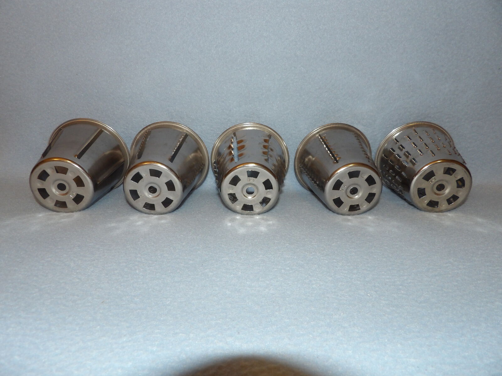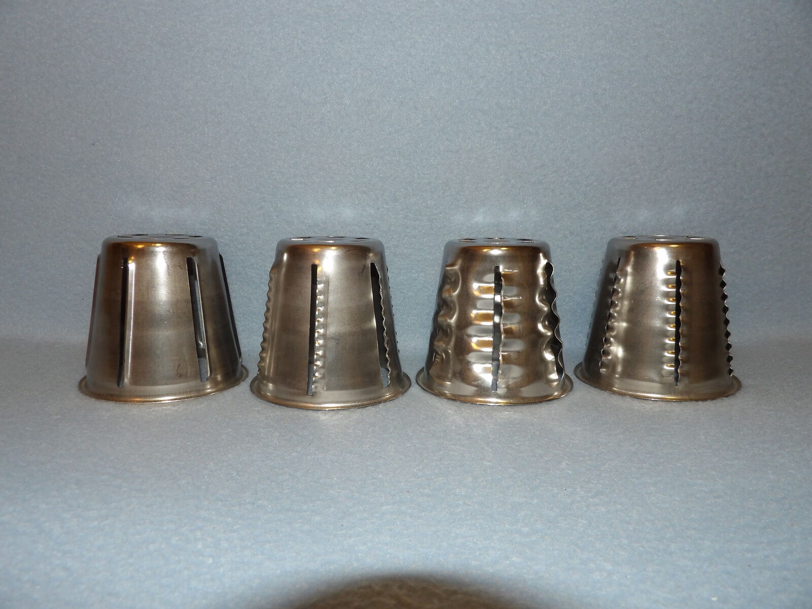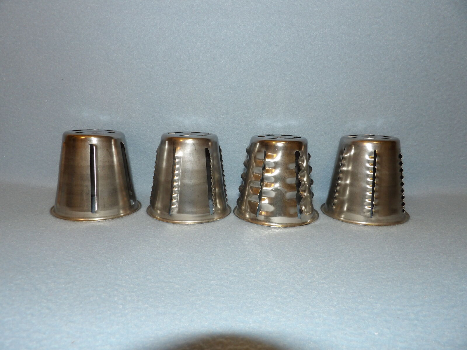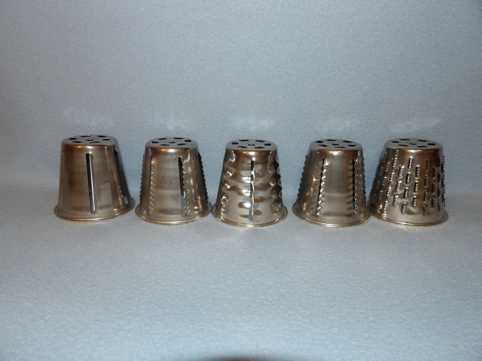 $80 Vegetable Shaft, “O” Cover, Attachment Disk, Food Tray, & 4 Metal Cones (Straight Slicer, Crinkle Cut Slicer, Julien, & Large Grate)