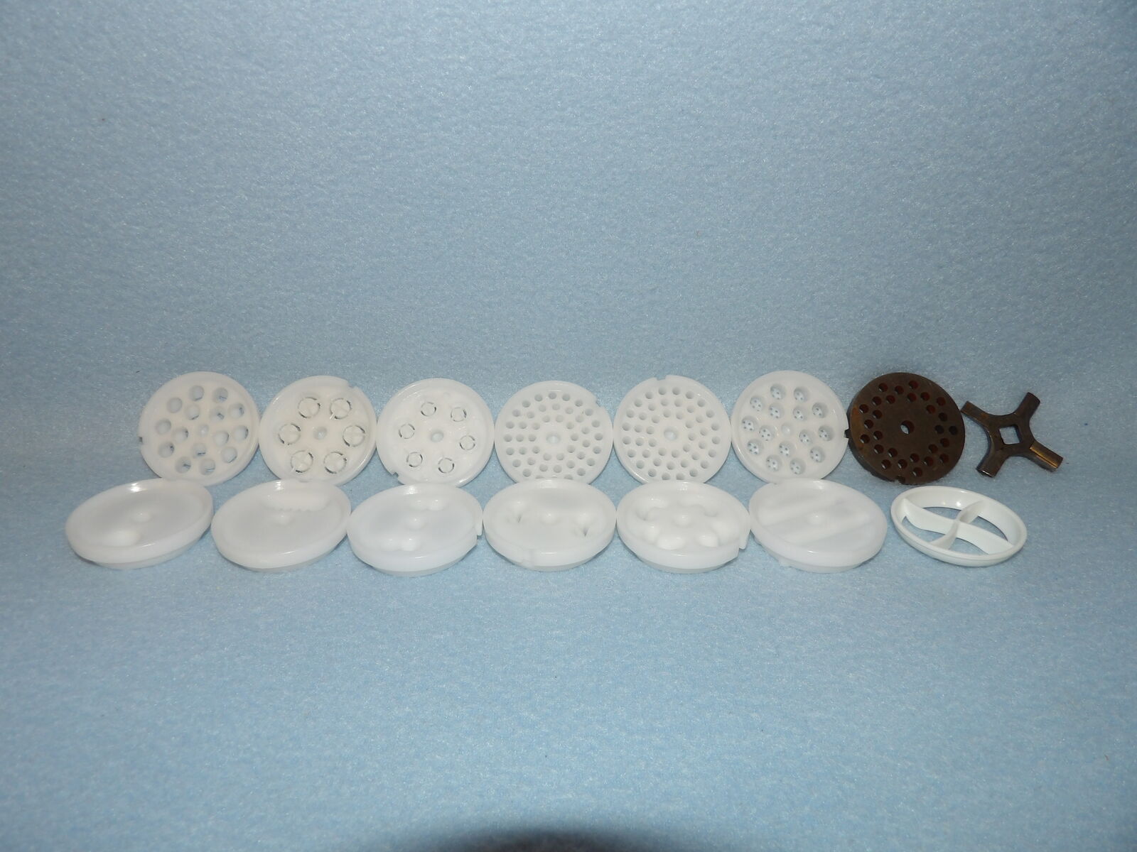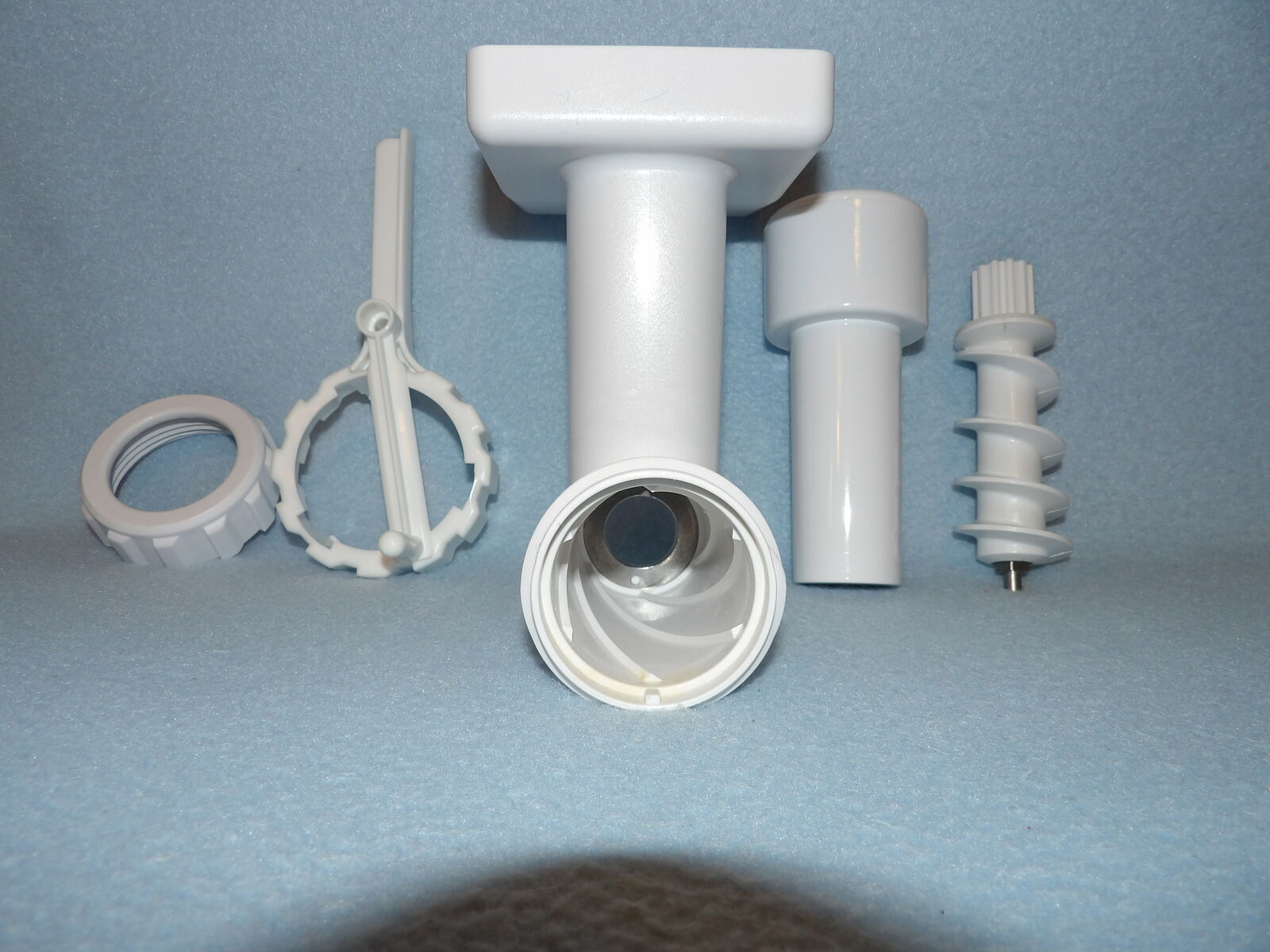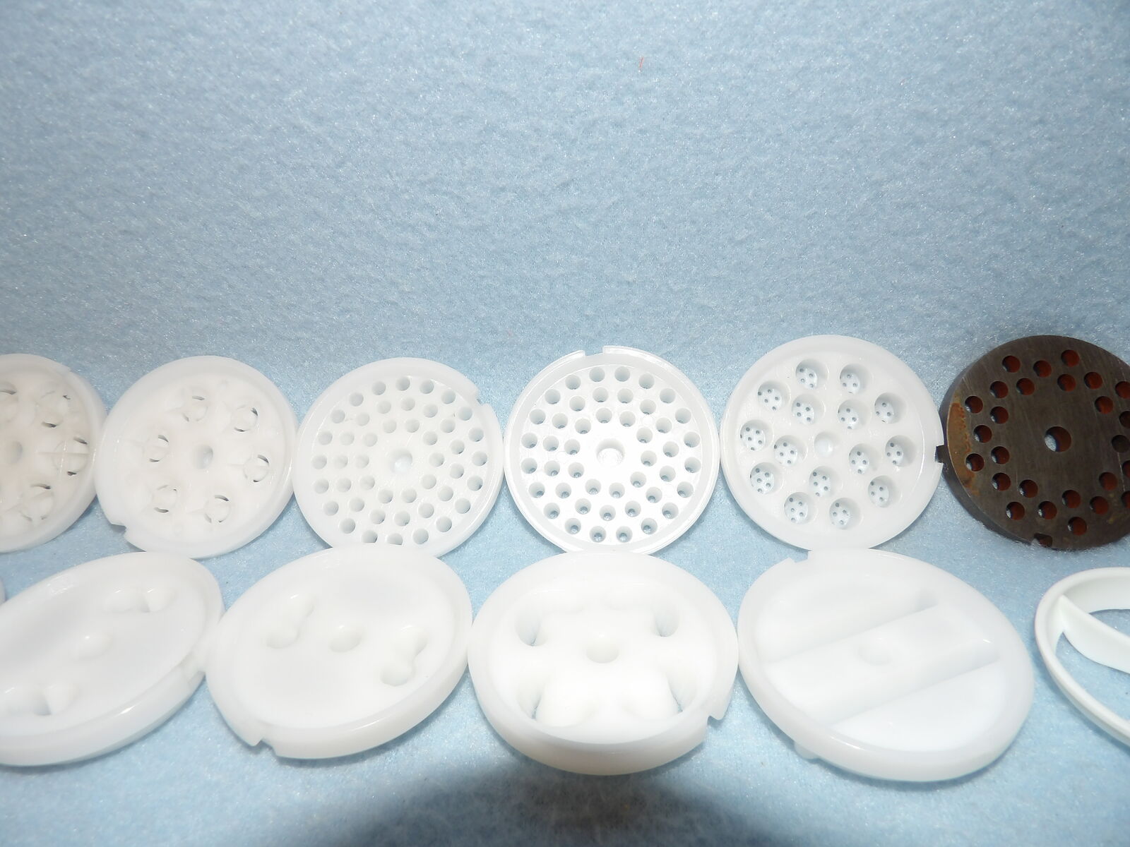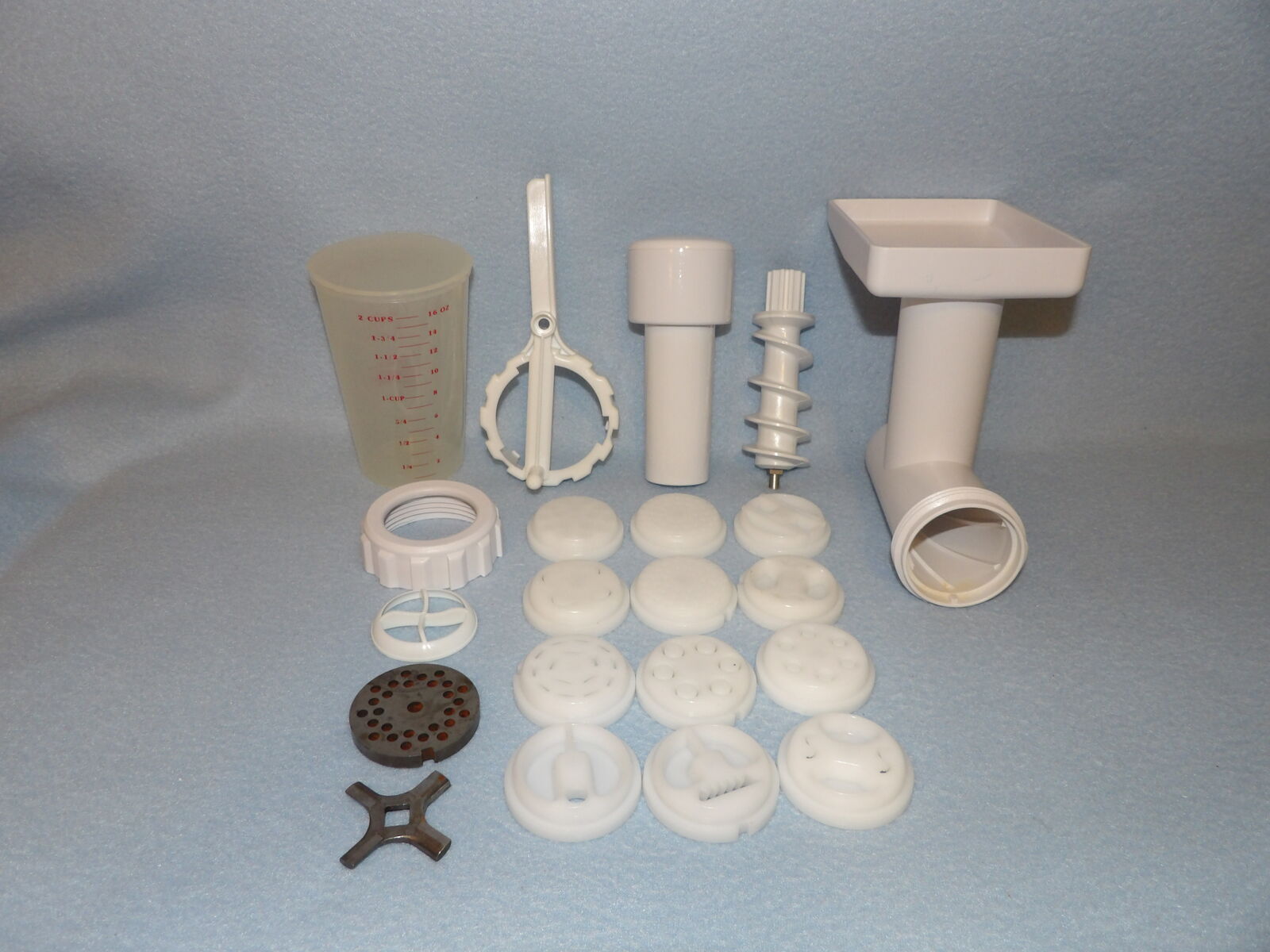 $130 - Pasta Maker/Meat Grinder Kit · 12 Pasta Dies – 11 are new, only 1 was ever used (Linguine one, I think) · Metal Meat Die & “X” piece – Never used, but has been washed & air dried & shows rust – see photos · Pasta/Meat Chute – Has some discoloring/yellowing · Churning Screw · Securing Ring (screws onto Pasta Chute) · Pasta/Meat Pusher · Pasta Slicer · Plastic “O” piece with an “x” inside it · Measuring Cup with Lid · VHS Tape/Instruction Infomercial