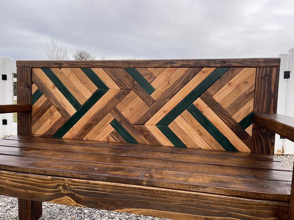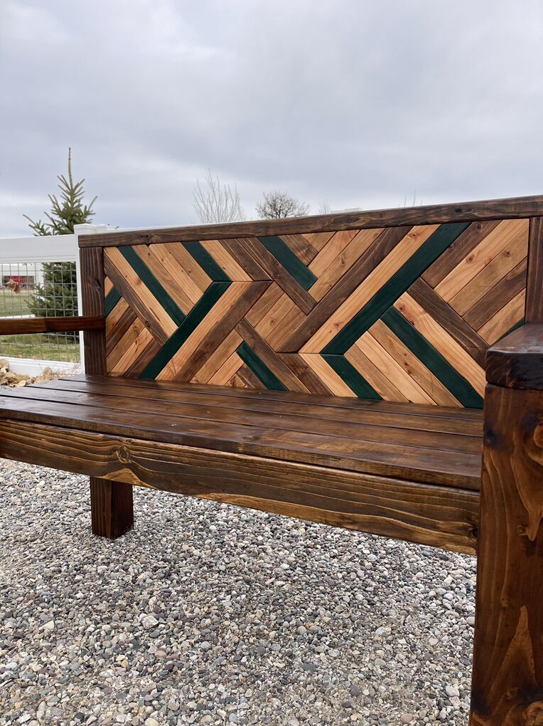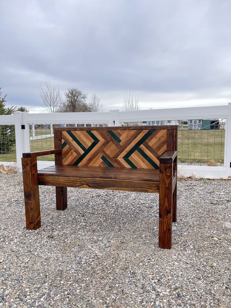 48” wide and 34” tall at the back. Perfect bench for porch, entry way, garden seating. Located in rigby Idaho but can coordinate drop off anywhere between island park and Utah county.