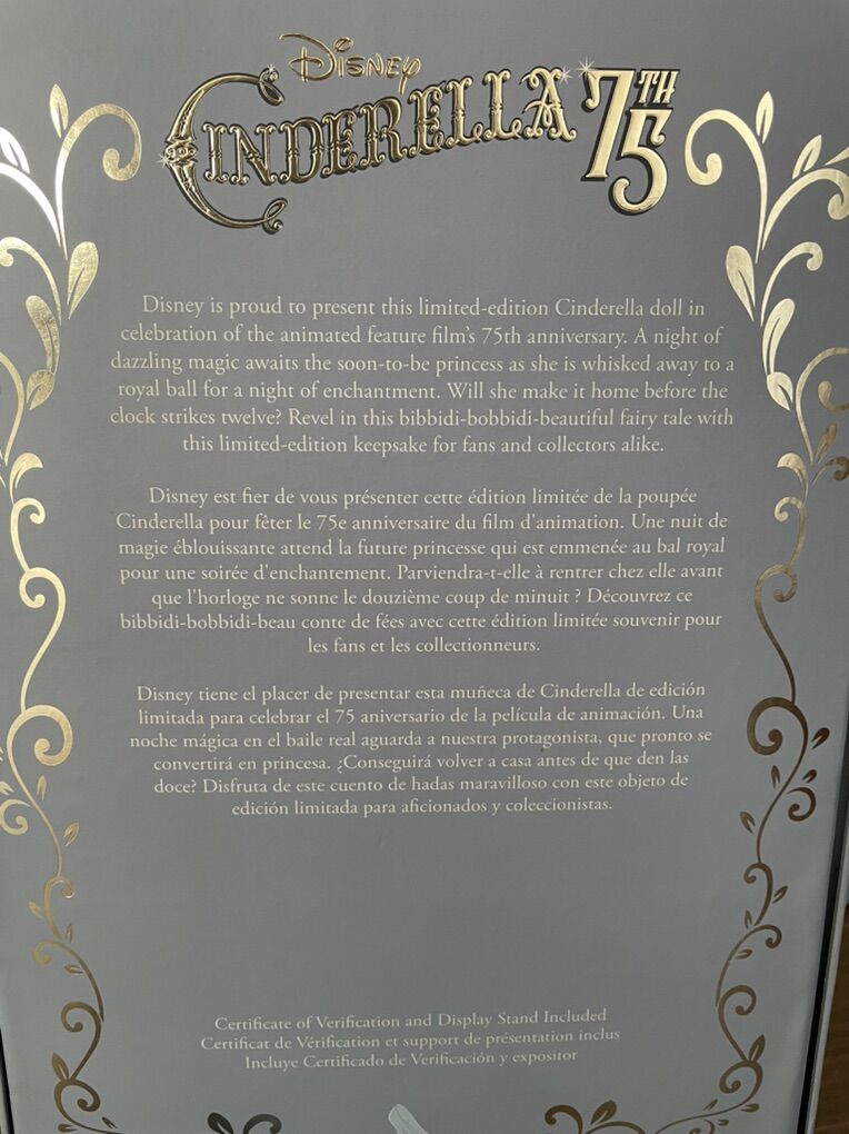 VenmoDisney’s Cinderella 75th Anniversary Special Edition Doll. Original. New, never opened box. Larger than a Barbie doll, about 16” tall. Limited edition with certificate of authenticity. $250 OBO. Thanks