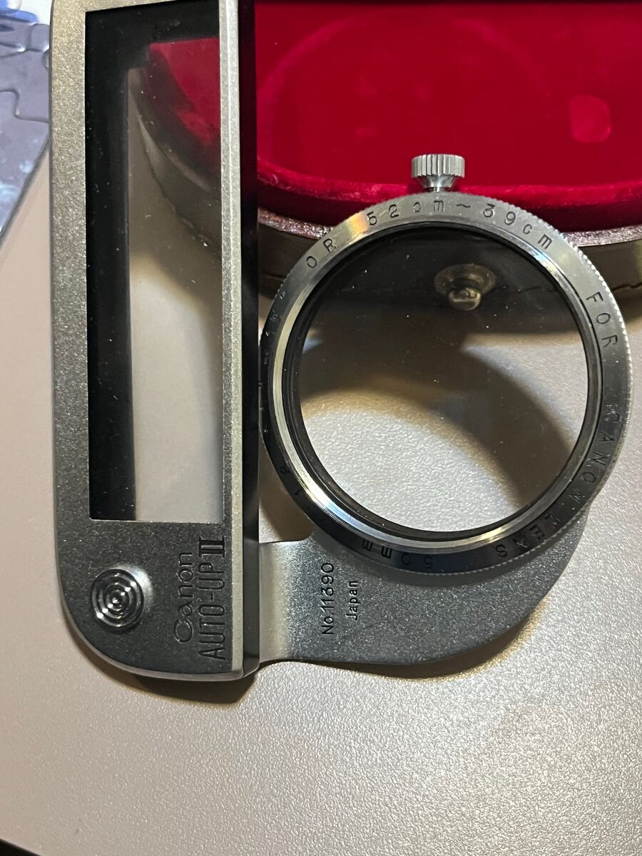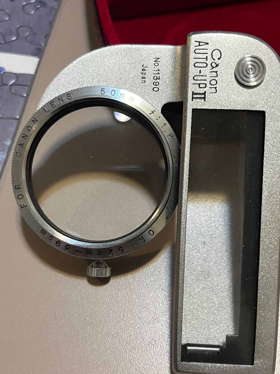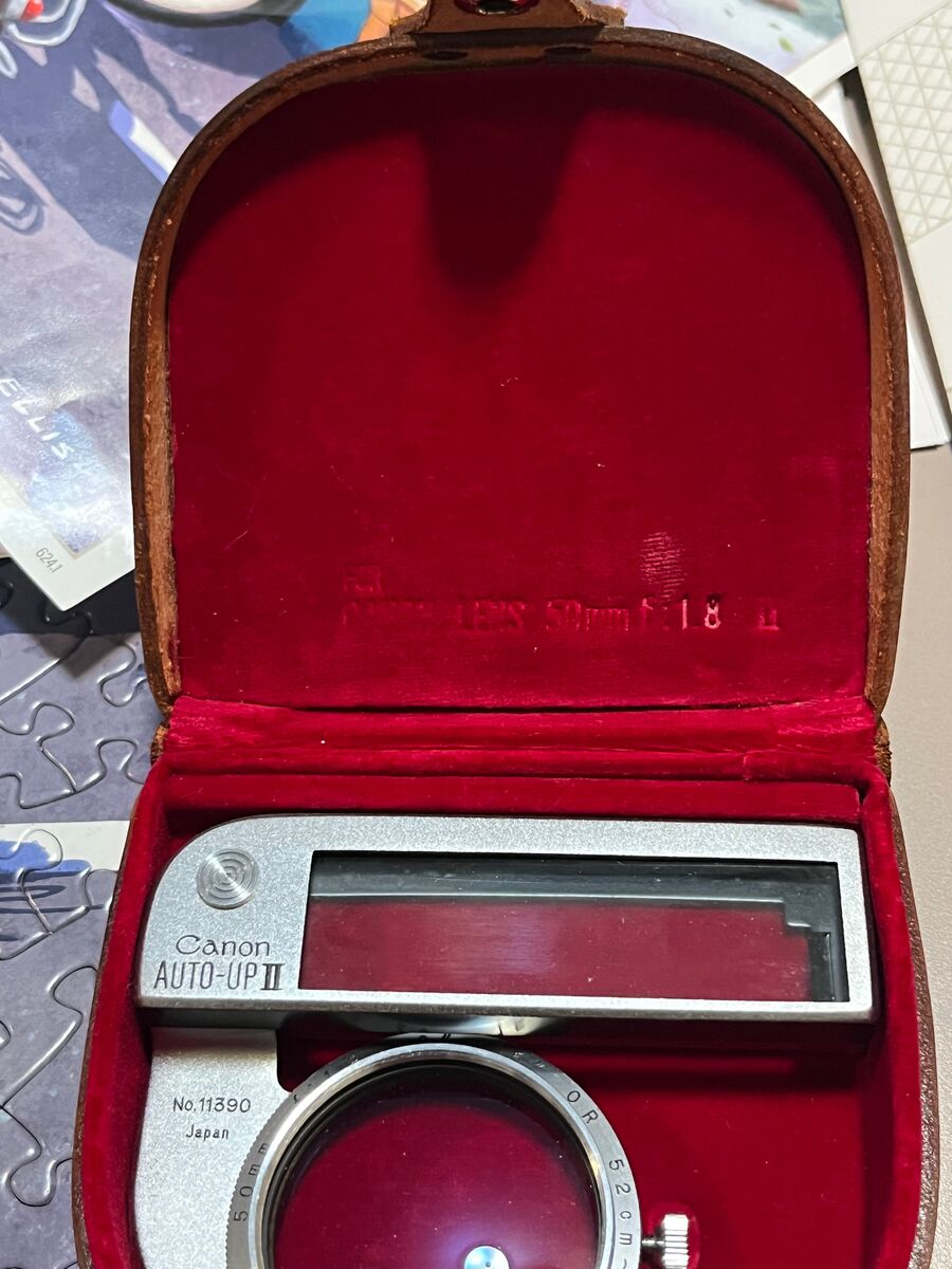 VenmoAuto-Up is a supplementary lens that can be used with Canon 50 mm lens to take close-ups of small objects that can't be taken with regular lens. Comes with leather case.