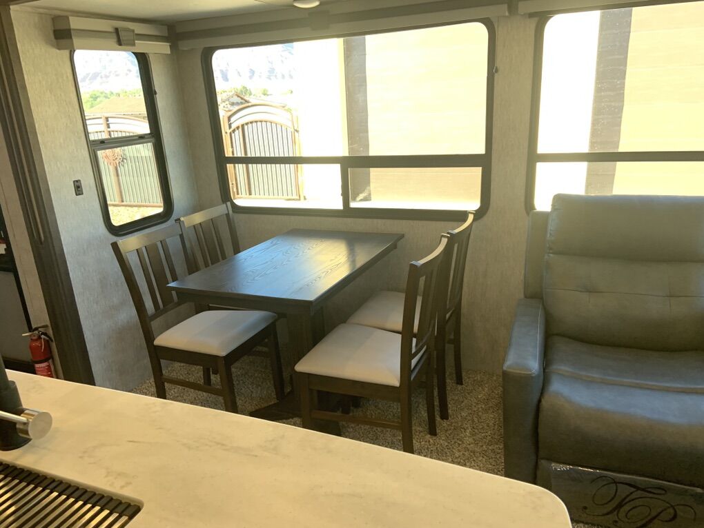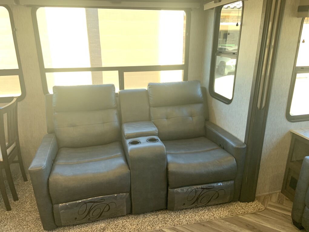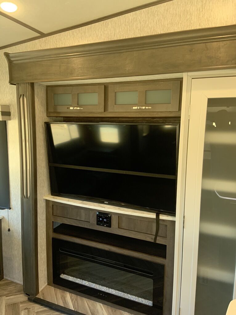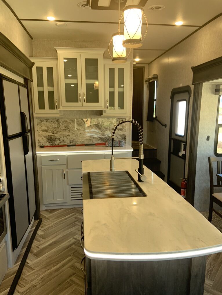Beautiful 5th Wheel that has only been used slightly. Living room: fold out couch, 2 recliners, large tv and sound system, electric fireplace for those cozy nights. Kitchen: island w/sink, pendant lights, 4-seat wood table, double fridge, lots of cabinets and storage, microwave and 4 burner stove and oven. Bathroom: separate bathroom with oversize shower, double sink, and toilet you can actually sit on and move. Bedroom: king bed with custom Mattress, tv, large closet and area for washer/dryer. Dual ac units and self leveling. Has rear hitch for tandem towing. This is an RV that is great for weekend trips or snowbird winters. There is nothing wrong with it.