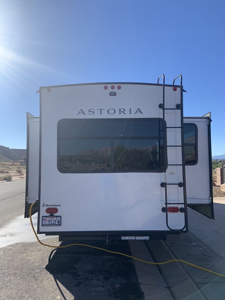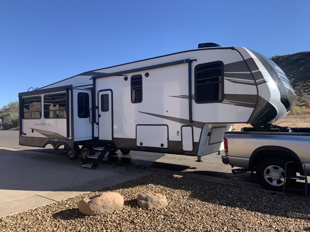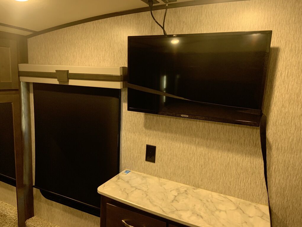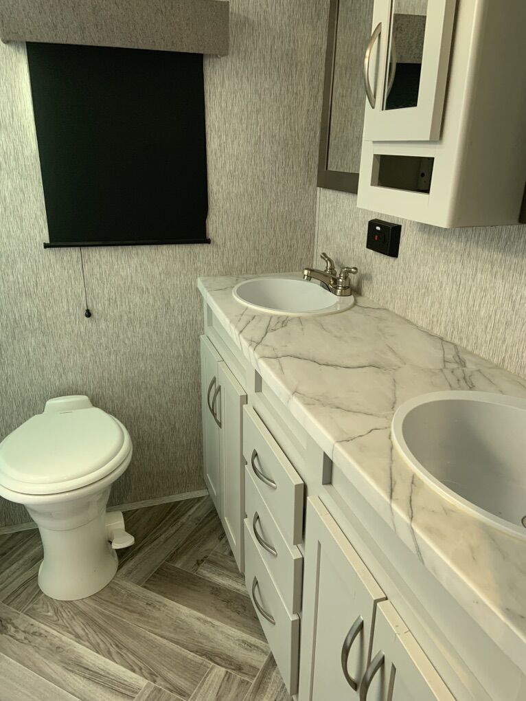 Beautiful 5th Wheel that has only been used slightly. Living room: fold out couch, 2 recliners, large tv and sound system, electric fireplace for those cozy nights. Kitchen: island w/sink, pendant lights, 4-seat wood table, double fridge, lots of cabinets and storage, microwave and 4 burner stove and oven. Bathroom: separate bathroom with oversize shower, double sink, and toilet you can actually sit on and move. Bedroom: king bed with custom Mattress, tv, large closet and area for washer/dryer. Dual ac units and self leveling. Has rear hitch for tandem towing. This is an RV that is great for weekend trips or snowbird winters. There is nothing wrong with it.
