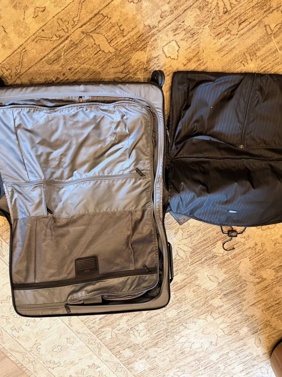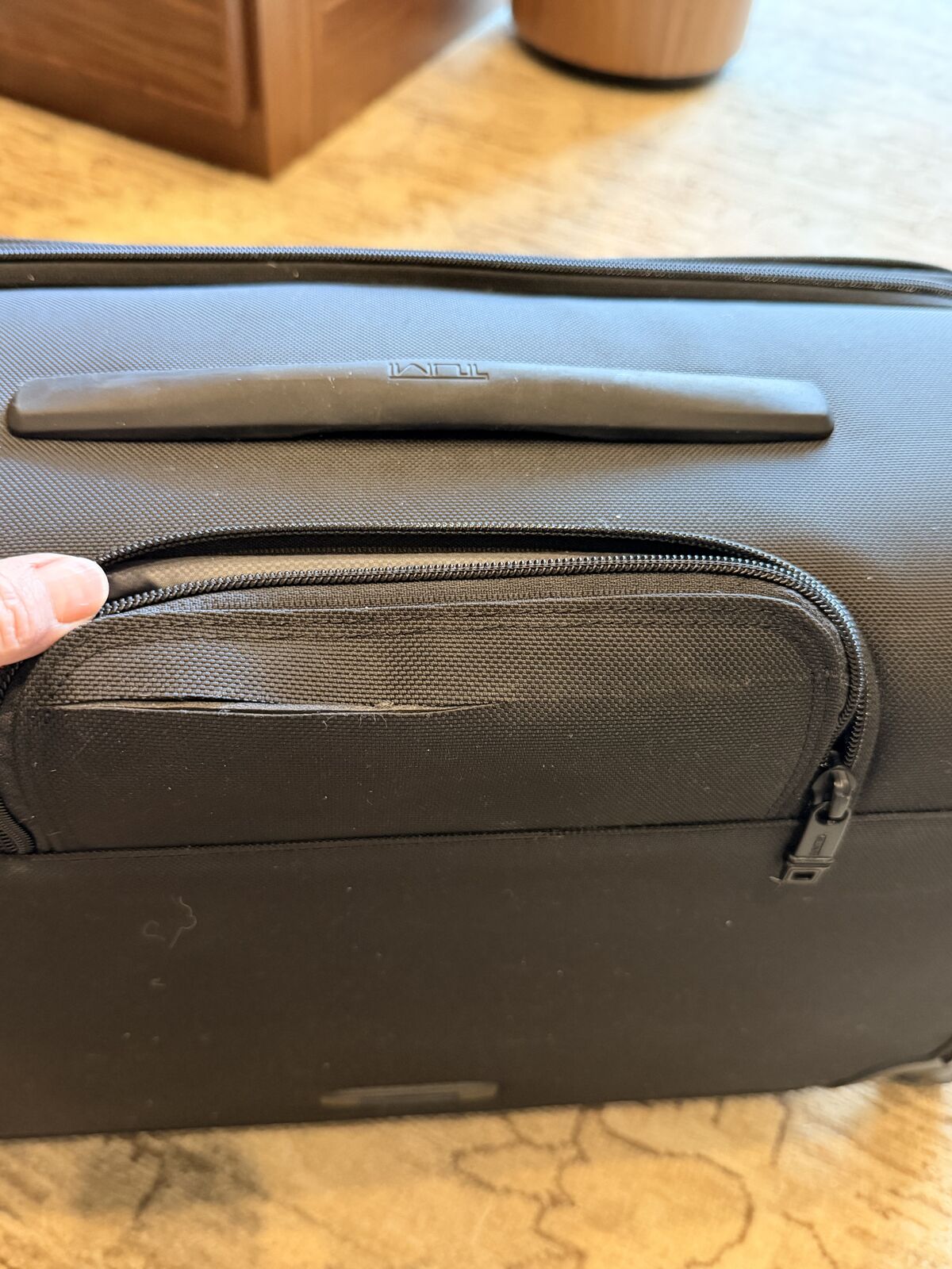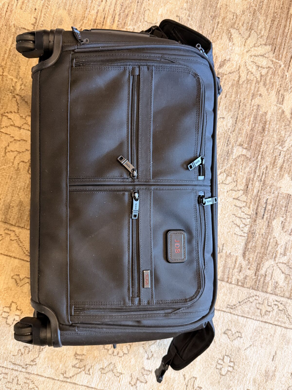 VenmoTumi business carry on. Has hanger inside for suit and shirts. Fits in overhead. Lots of pouches and sections for organize clothing. a tear where the collapsable handle goes in but does not affect anything in the working of the suitcase. 5 years old and used only twice. You can take it to a Tumi store and have the letters engraved and replaced on the front of the case. Perfect condition except for the tear. Paid over $1000.