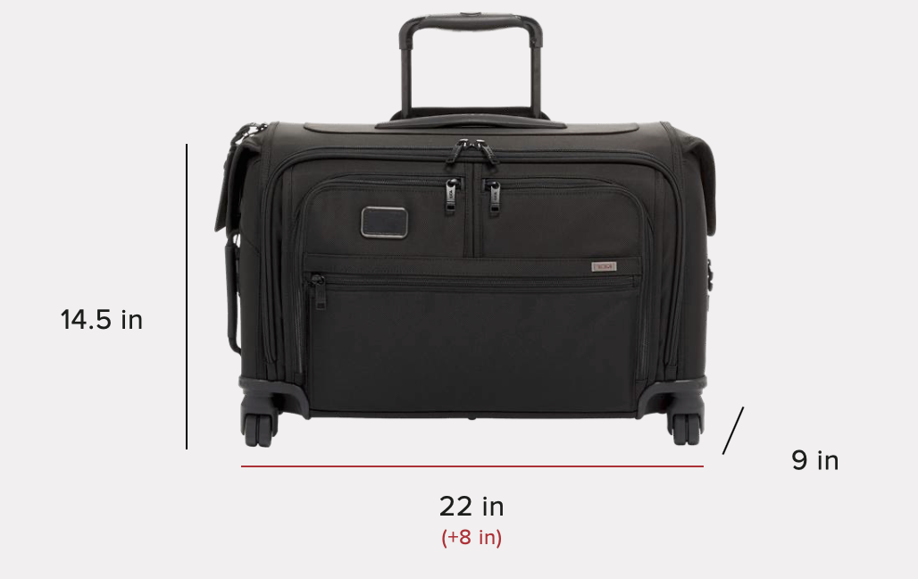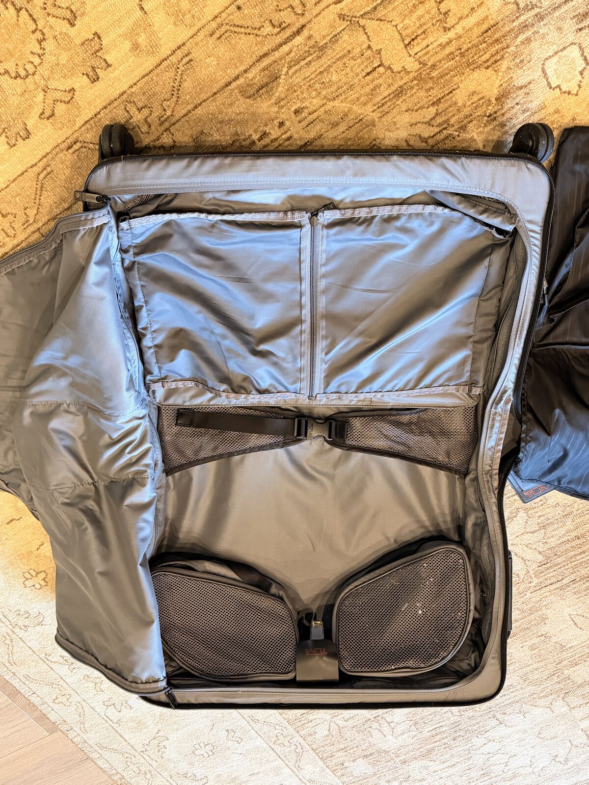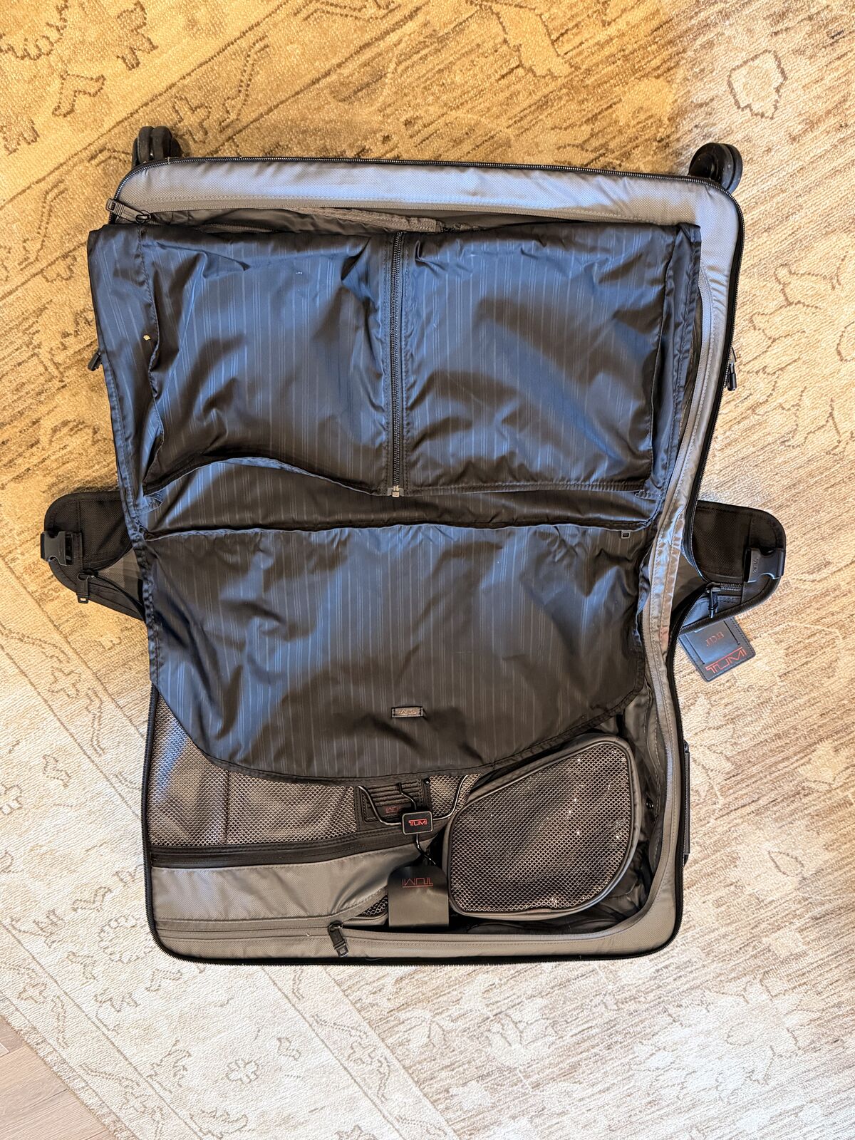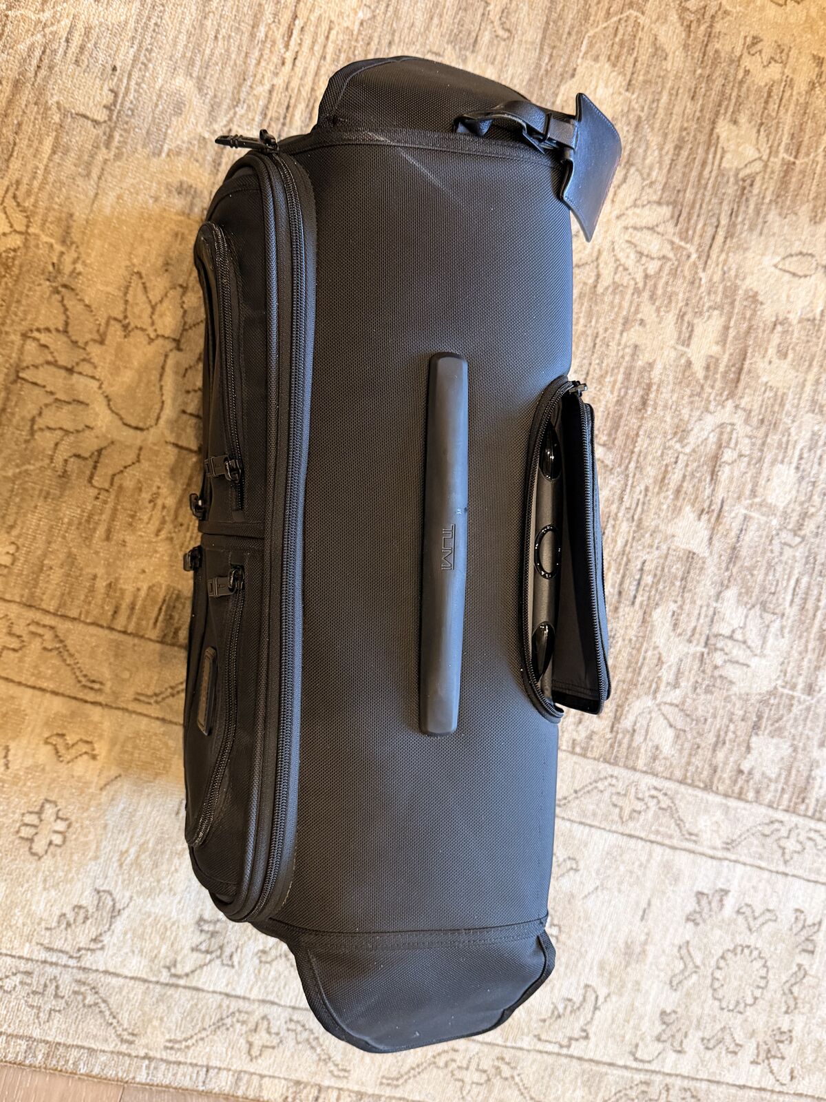 VenmoTumi business carry on. Has hanger inside for suit and shirts. Fits in overhead. Lots of pouches and sections for organize clothing. a tear where the collapsable handle goes in but does not affect anything in the working of the suitcase. 5 years old and used only twice. You can take it to a Tumi store and have the letters engraved and replaced on the front of the case. Perfect condition except for the tear. Paid over $1000.