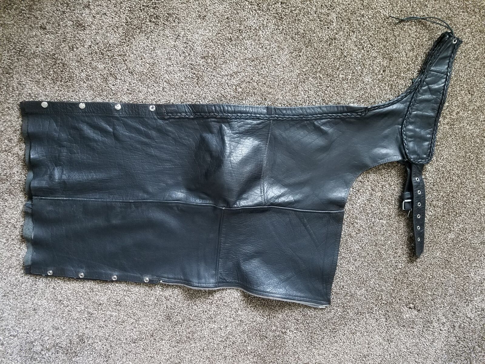VenmoBlack motorcycle chaps, men’s size 32 to 38 waist, 33 to 35 inseam. Full zippered legs with 4 snaps down bottom of each leg. Excellent, Super Clean Condition.