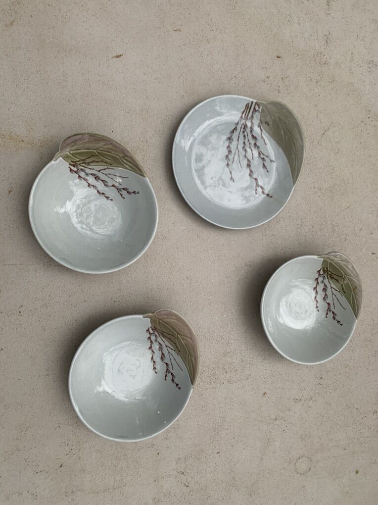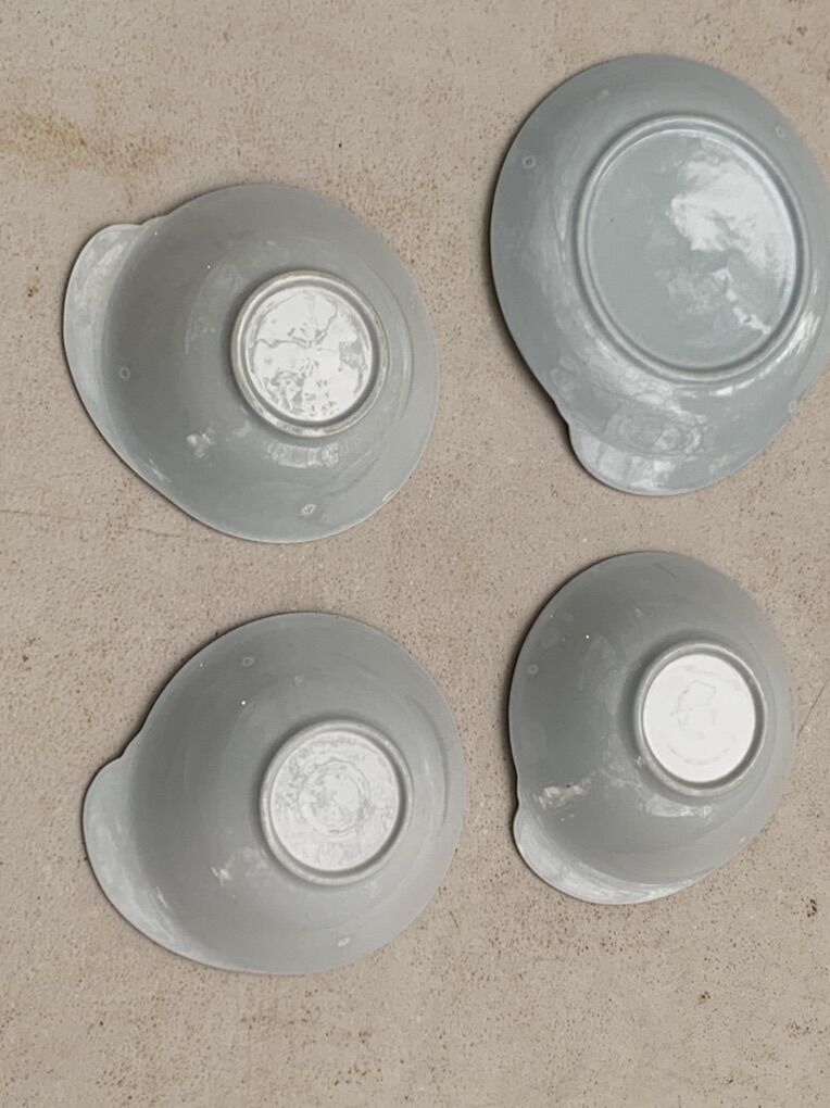 One bowl has a small crack. No chips on any bowl. Four bowls have flea bite chips on the back. No cracks.