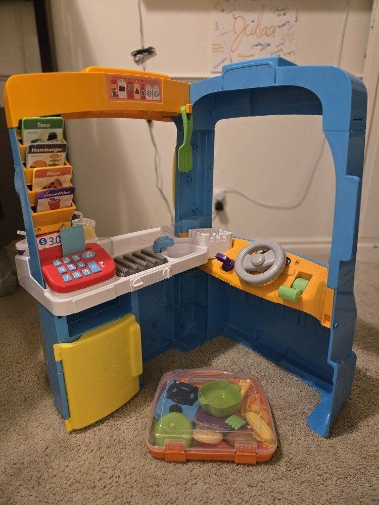Laugh & Learn Servin’ Up Fun Food Truck Activity Center comes with all the original accessories plus an additional food kit I purchased separately. Sells new from Walmart for $189, link below. https://share.google/l6B5F0asA81rY0u4h
