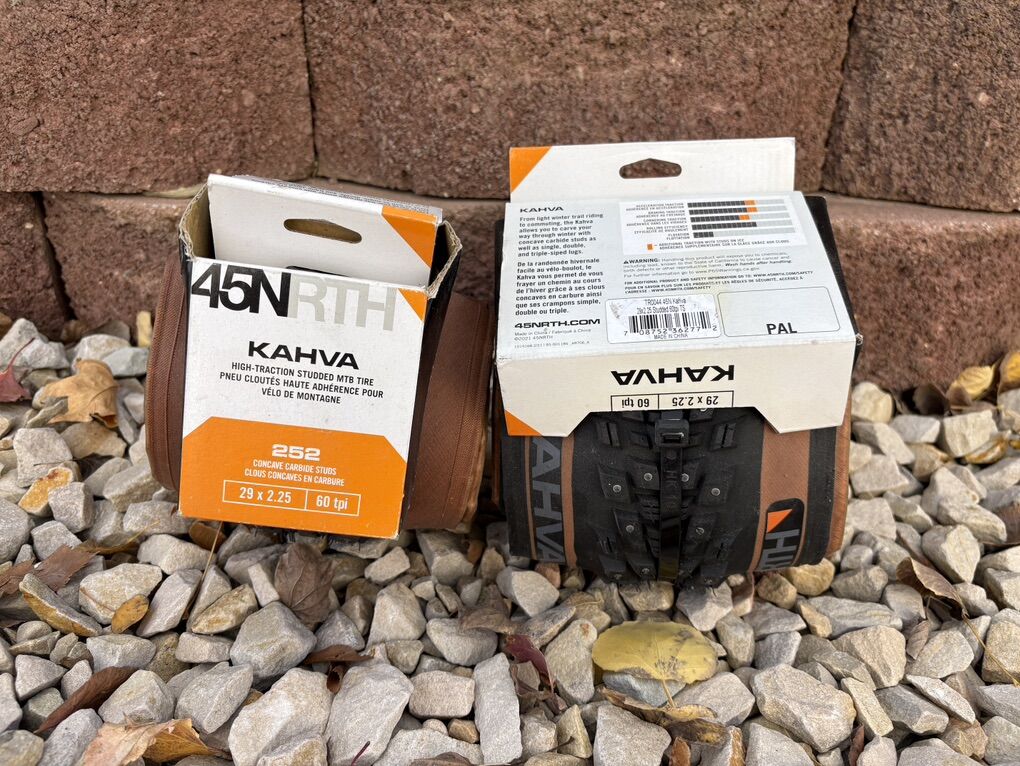 PayPalI have a new/unused pair of 45NRTH Kahva Tubless Ready Studded Tanwall Tires 60tpi 29x2.25 that I don’t need. These are good for riding in icy conditions on the trail or road, but don’t give you any additional advantage in the snow. These retail for $190 each or $380 for the pair. I’m selling the pair for $300.