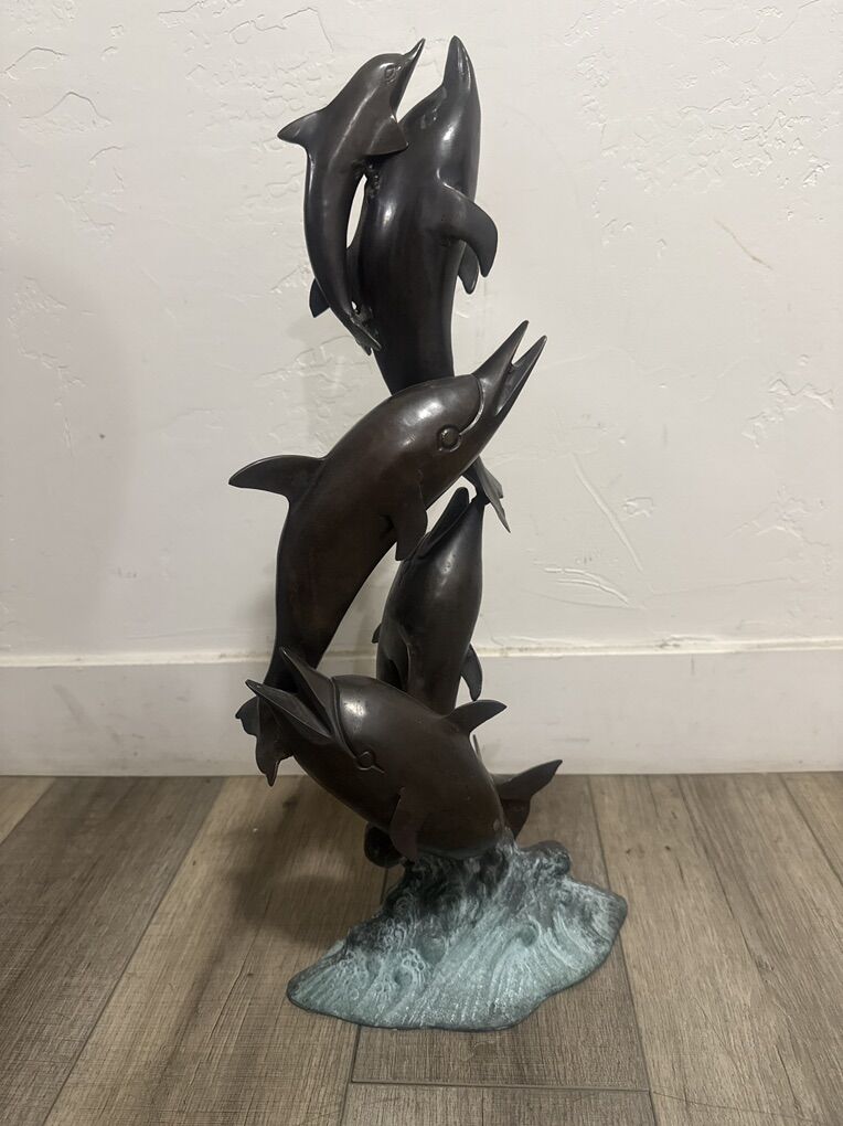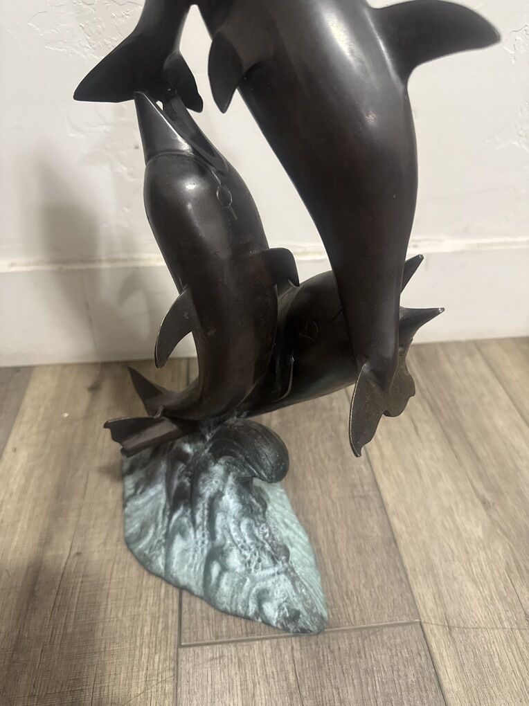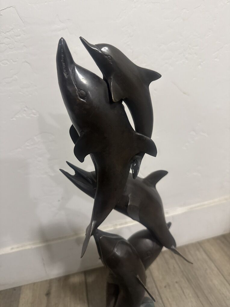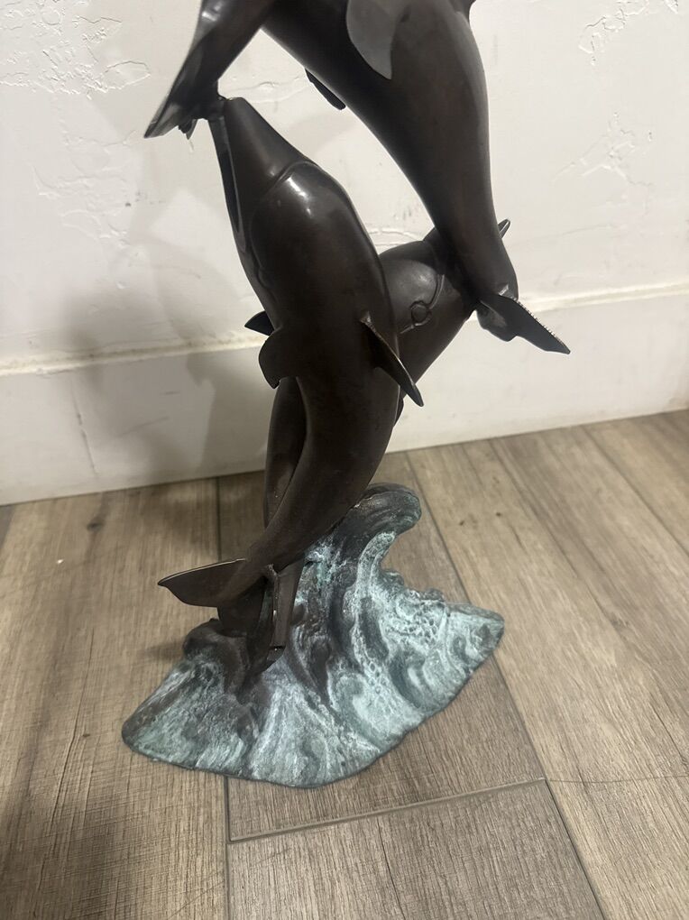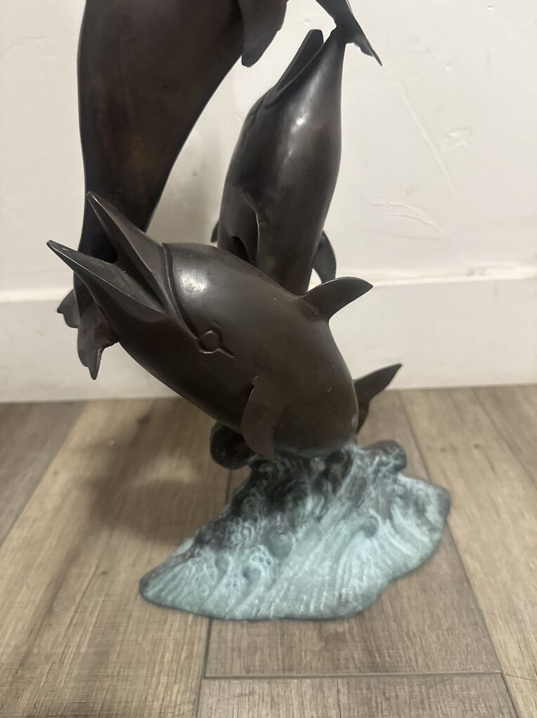 Vintage Dolphins pod jumping wave metal/bronze decorative sculpture 22.5 inches tall 10 1/4 across pre-owned in good condition