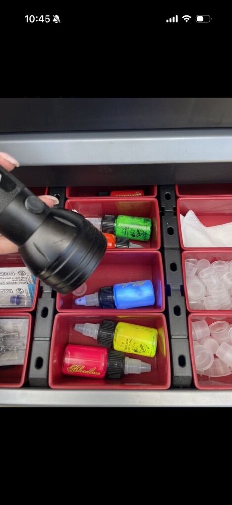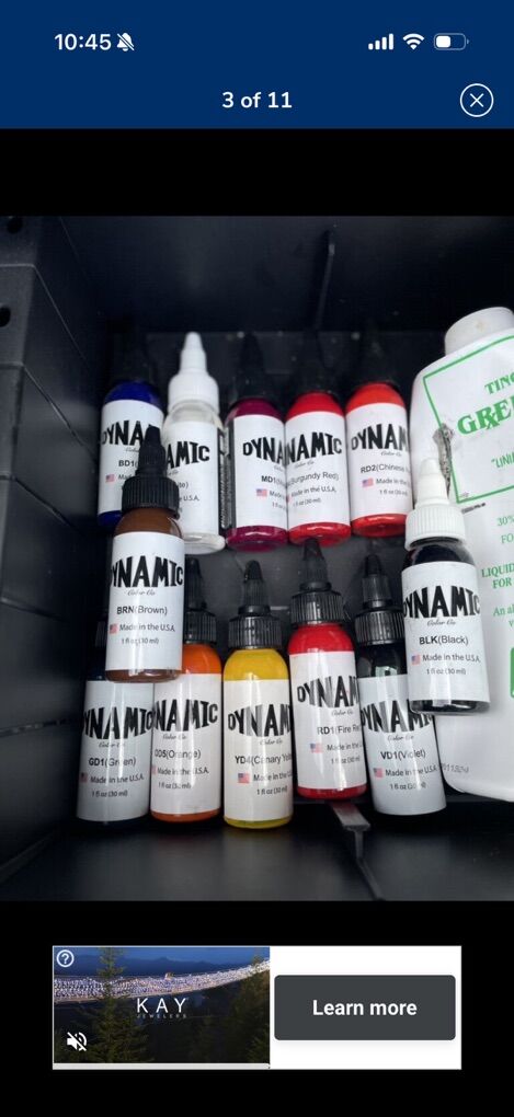 -Bronc touch screen power supply with pedal -Black and Red tattoo pen (forgot brand I think it’s also a Bronc) -Dynamic Ink (Small Bottles): Full range of every color for creative freedom -Dynamic Ink (Large Bottles): Black and white for core shading and line work -Glow-in-the-Dark INVISIBLE Inks: Multiple vibrant colors for standout designs -Blacklight Flashlight: Perfect for showcasing invisible glow-in-the-dark tattoos -Practice Fake Skins: A large variety of sizes and textures to simulate real skin. High end brands. -Tattoo Needles: Wide assortment of types and sizes for different techniques -Saniderm Roll: For professional aftercare and healing -Box of Black Gloves (Small): Hygiene essentials -Ink Cups: Plenty to keep your colors organized during sessions -Painless Tattoo Topical Anesthetic: For client comfort -Tattoo Grip Tape (4 Rolls): Improves machine handling and comfort -Black Bibs: Keep your workspace clean and professional incase ink spills -Green Soap Bottle: Essential for prepping and cleaning skin -Green Glide: Helps reduce friction and soothe skin during tattooing making it comfortable for person getting tattooed. -Tattoo Stencil Paper: For transferring your designs with precision