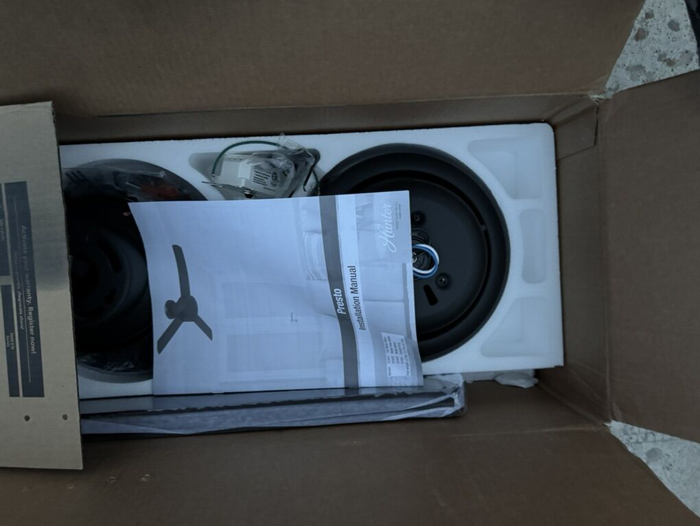 Description: Selling a brand new Hunter Presto ceiling fan (Model 52401), still in original box, never installed. This is a 120V indoor ceiling fan with a sleek matte black finish and 44-inch blade span, ideal for small rooms or modern spaces.