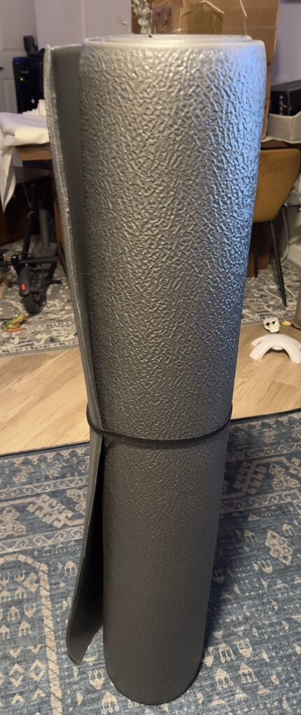Specs: • Size: 114” L x 49” W (9.5 ft x 4 ft) • Material: High-density closed-cell foam (EVA/PVC blend) • Color: Black • Textured non-slip top surface • Water-resistant, easy to clean • Cushions impact and reduces vibration/noise • Rolls up for storage (strap included)