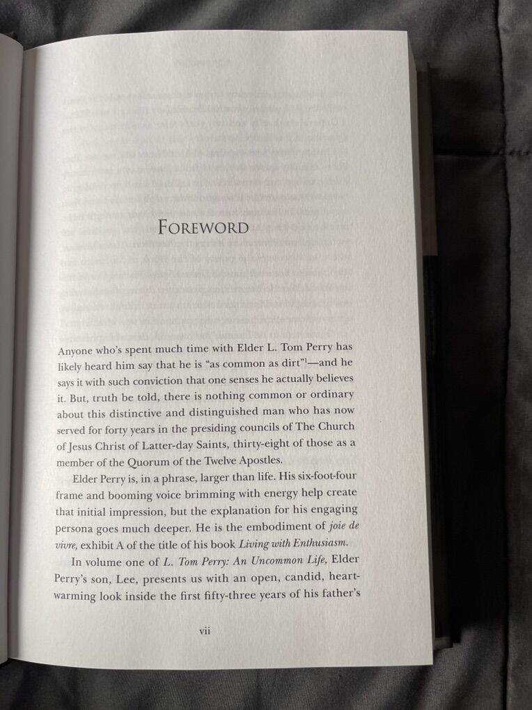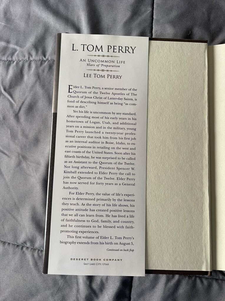 VenmoI’m selling the book by L. Tom Perry An Uncommon Life Years of Preparation. The author of the biography is Elder L. Tom Perry’s son Lee Tom Perry. The book is about his childhood, youth, adulthood, marriage, his call to the quorum of the twelve apostles, and the passing of his wife. If you’re interested in this book please send me a message.