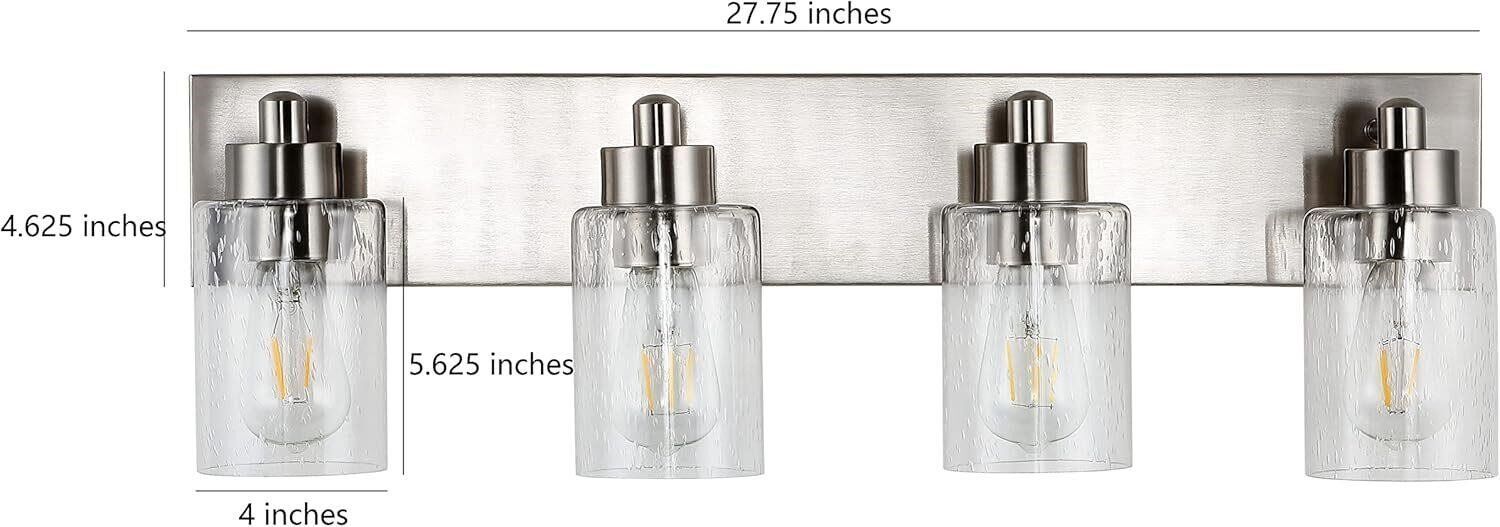 Eyely EYL7558A 4-Light Seeded Glass Vanity Nickel This 4-light fixture is perfect for a single sink in any bathroom. Base measures 27.7 inch long and 4.6 high. Each Clear Glass Shade measures 5.6 inches long and has a 4 inch diameter.