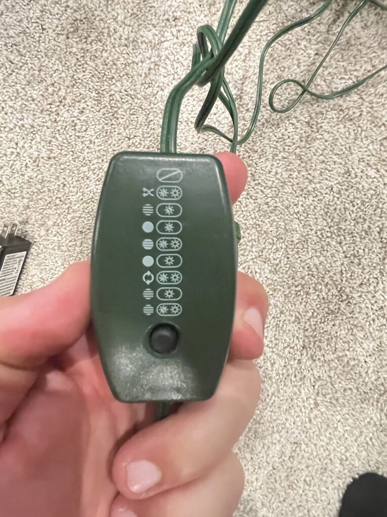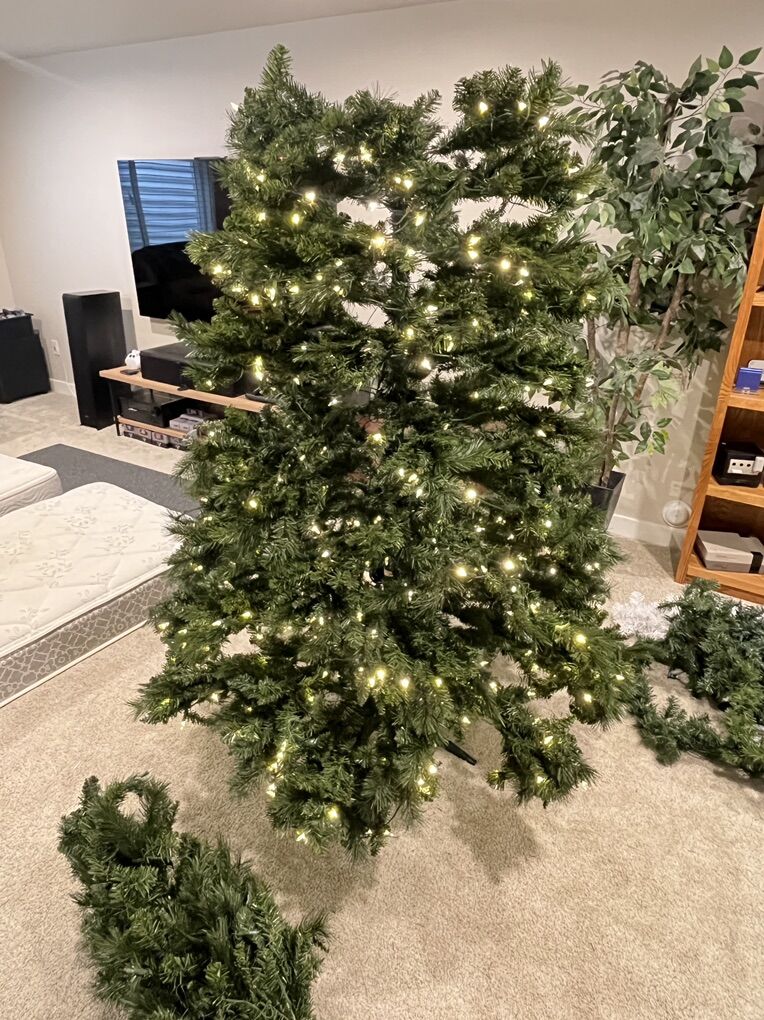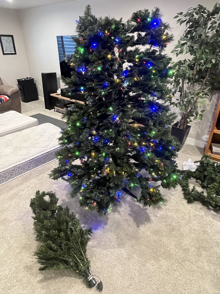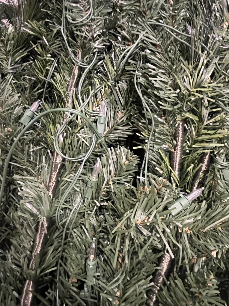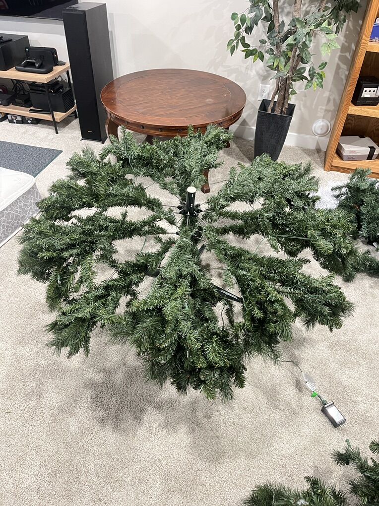 Venmoused 9 ft Christmas Tree. White/Multi-colored. Smoke free house. We need something taller for our main floor (9ft worked good but have ordered a 14 ft high one). In the pics, it doesn’t show the 4th piece on top due to the lower basement ceilings. Nothing wrong, broken, etc. Everything works good. Also the light cord is about 10 ft in length.
