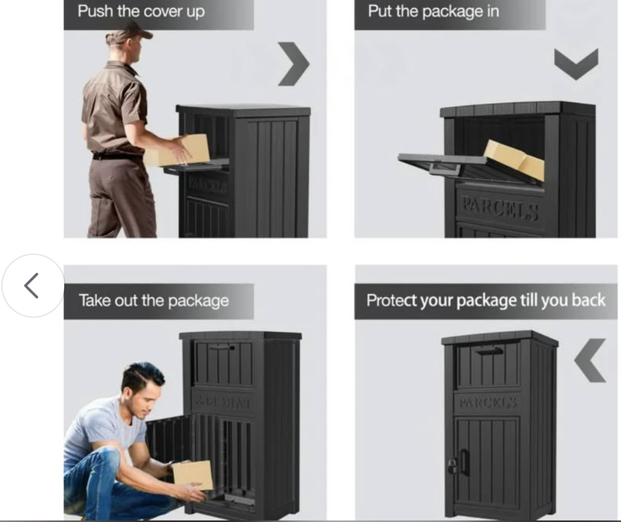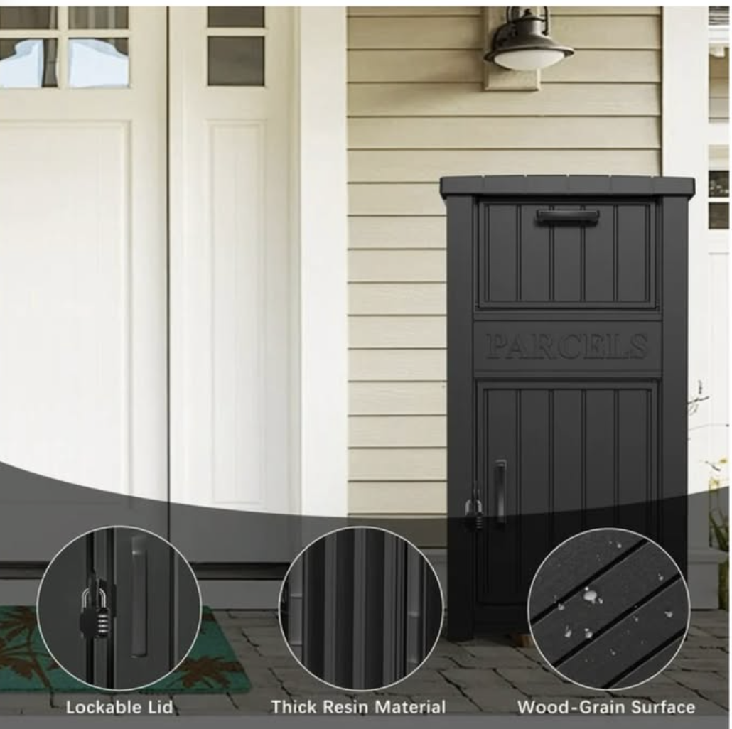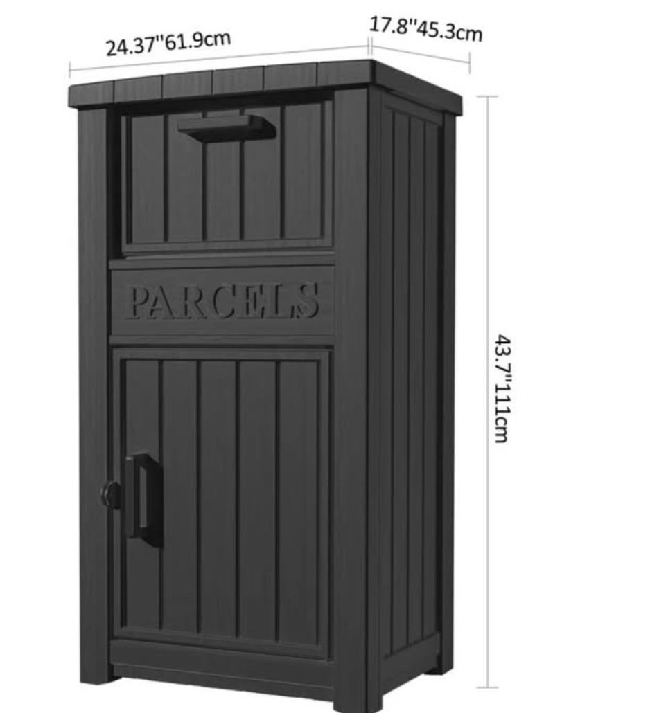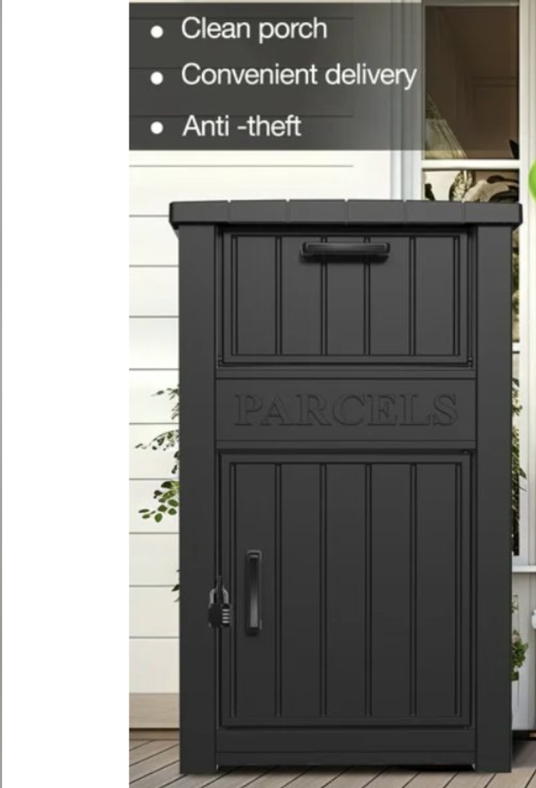 Brand new in box, UNASSEMBLED, Package Delivery Box for Outside, Storage Box with Lockable Secure,Anti-Theft Parcel Drop Boxes Outdoor Package Delivery and Waterproof Deck Box for Porch, House, 24.37"*17.8"*43.7" The Package Delivery Box is a secure outdoor storage solution designed to keep your parcels safe. Featuring a lockable, anti-theft design, it is perfect for use on porches, at houses, or curbside. Its waterproof construction ensures your packages stay dry in any weather. Anti-Theft Protection for Enhanced Security - The Outdoor Package Delivery Box features a precision-engineered anti-theft device to protect your parcels while you are away. With a sturdy internal baffle to prevent unauthorised access, it effectively protects your parcels from thieves, stray animals and curious neighbours. Maximum protection for your delivery. Spacious Storage Space - The overall size of the delivery box is 24.37"*17.8"*43.7" The parcel drop box is thoughtfully designed. It can hold multiple parcels, say goodbye to the inconvenience of missing a delivery when you are not at home. Better management and convenience of your items. Premium Material - The parcel courier box made of high quality resin can effectively withstand typhoons, rain and snow, and is suitable for year-round use; the sturdy structure and thick wall panels further prolong the service life Versatile Usag - In addition to providing a storage solution for parcels, this drop box can also help organise tools indoors and outdoors for a wide range of uses. Classic colours and minimalist style make it the perfect dust-proof decoration for porches, curbs, flats, offices, shops and more. Easy to install - The included detailed instructions make it easy to install the parcel delivery box, which can be done by a single person in just a few steps