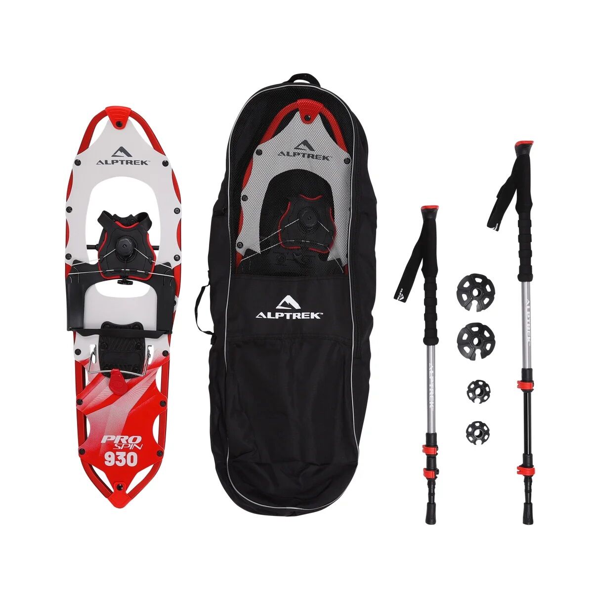 All-in-one snowshoe kit includes: (1) Pair of ALPTREK Pro SPIN snowshoes (1) pair of aluminum EVA grip trekking poles, trekking pole accessories (1) carry bag