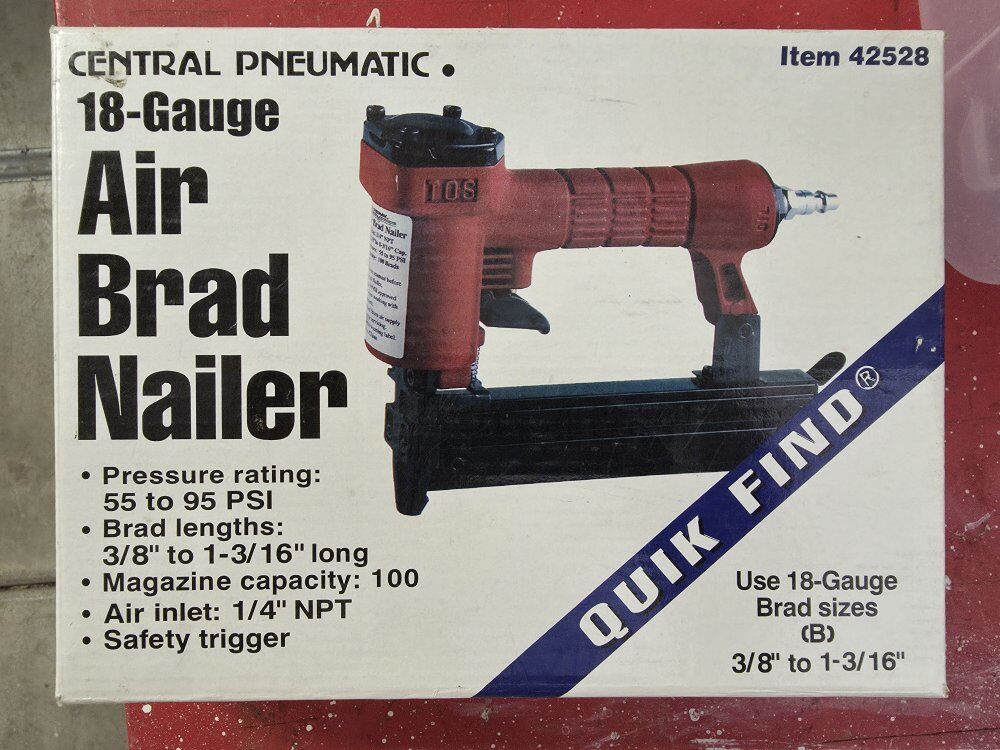 Seems new in box. I don't think its been used. There are 4-5 brads in it. Tested it- works perfect. Includes owner's manual, allen keys, and extra o-rings.