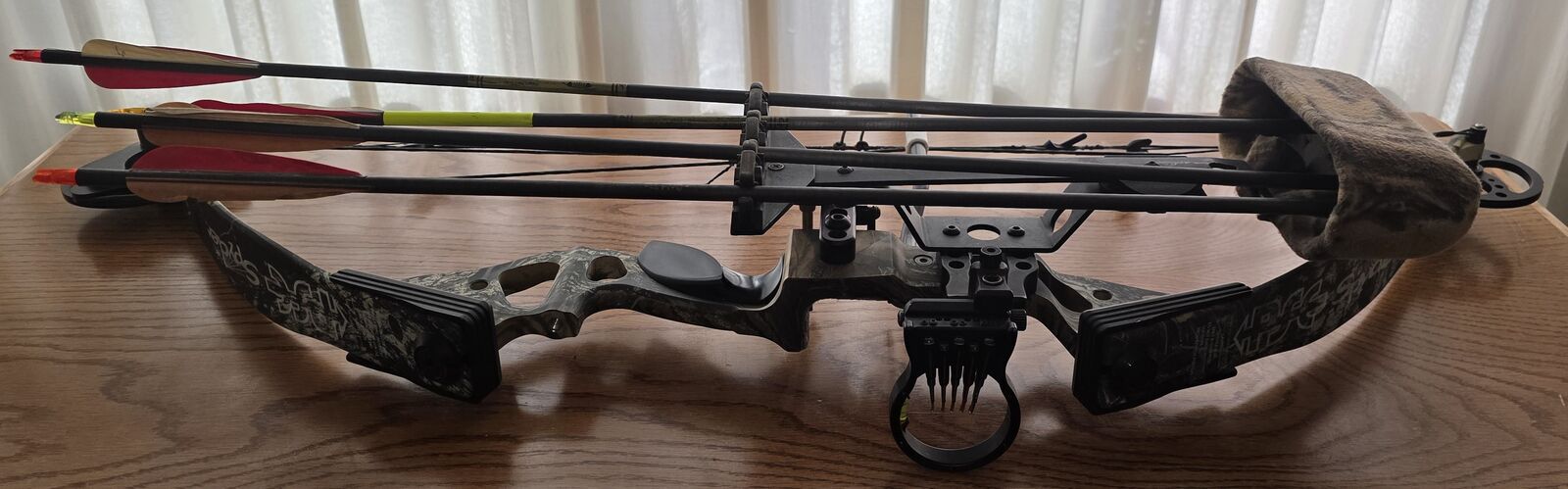 VenmoPSE Compound Bow Spider edition 40 pound, 28 inch draw, 75% let Off. 5 pin colored adjustable pin site. Ripcord adjustable arrow release. Attached 7 arrow quiver holder. The four arrows in the picture come with the bow.
