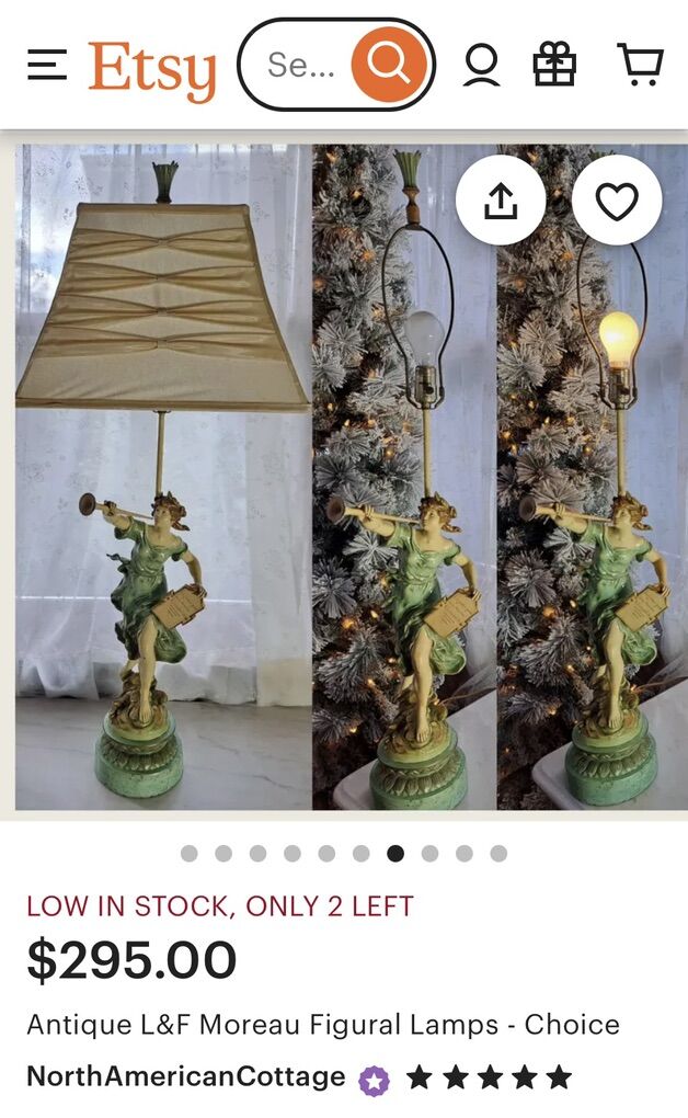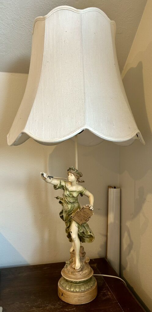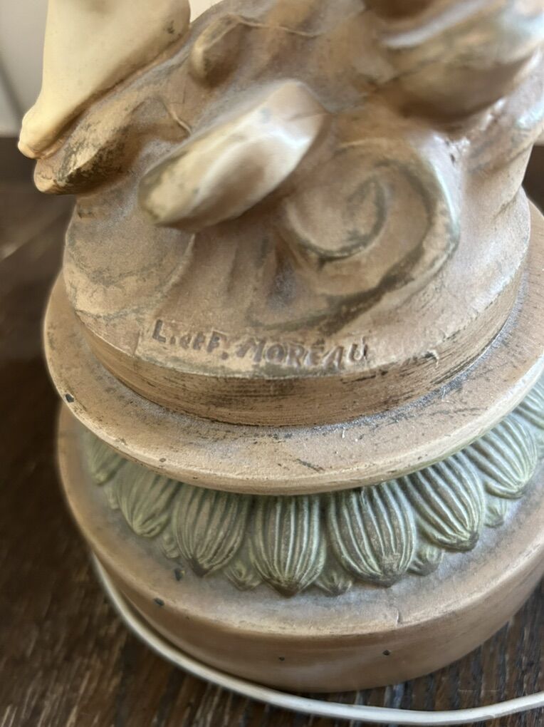 ZelleKey information about this type of lamp: Artists: The lamp is signed by L&F Moreau, a collective name for French sculptors Louis Auguste Moreau and Hippolyte Francois Moreau. Period: These lamps generally date from the late 19th or early 20th century, around the 1890-1910 period. Material: They are typically made from spelter (a zinc alloy) or white metal, which is then painted. Condition: The specific lamp in the image shows signs of age, including paint chipping and discoloration, which is common for these antique items. Value: Similar antique L&F Moreau figural lamps can range significantly in price depending on condition and rarity, sometimes listed for hundreds or thousands of dollars.