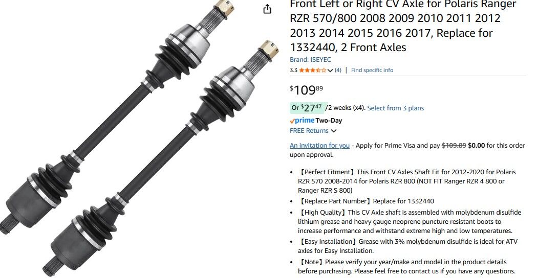 Perfect FitmentThis Front CV Axles Shaft Fit for 2012-2020 for Polaris RZR 570 2008-2014 for Polaris RZR 800 (NOT FIT Ranger RZR 4 800 or Ranger RZR S 800)