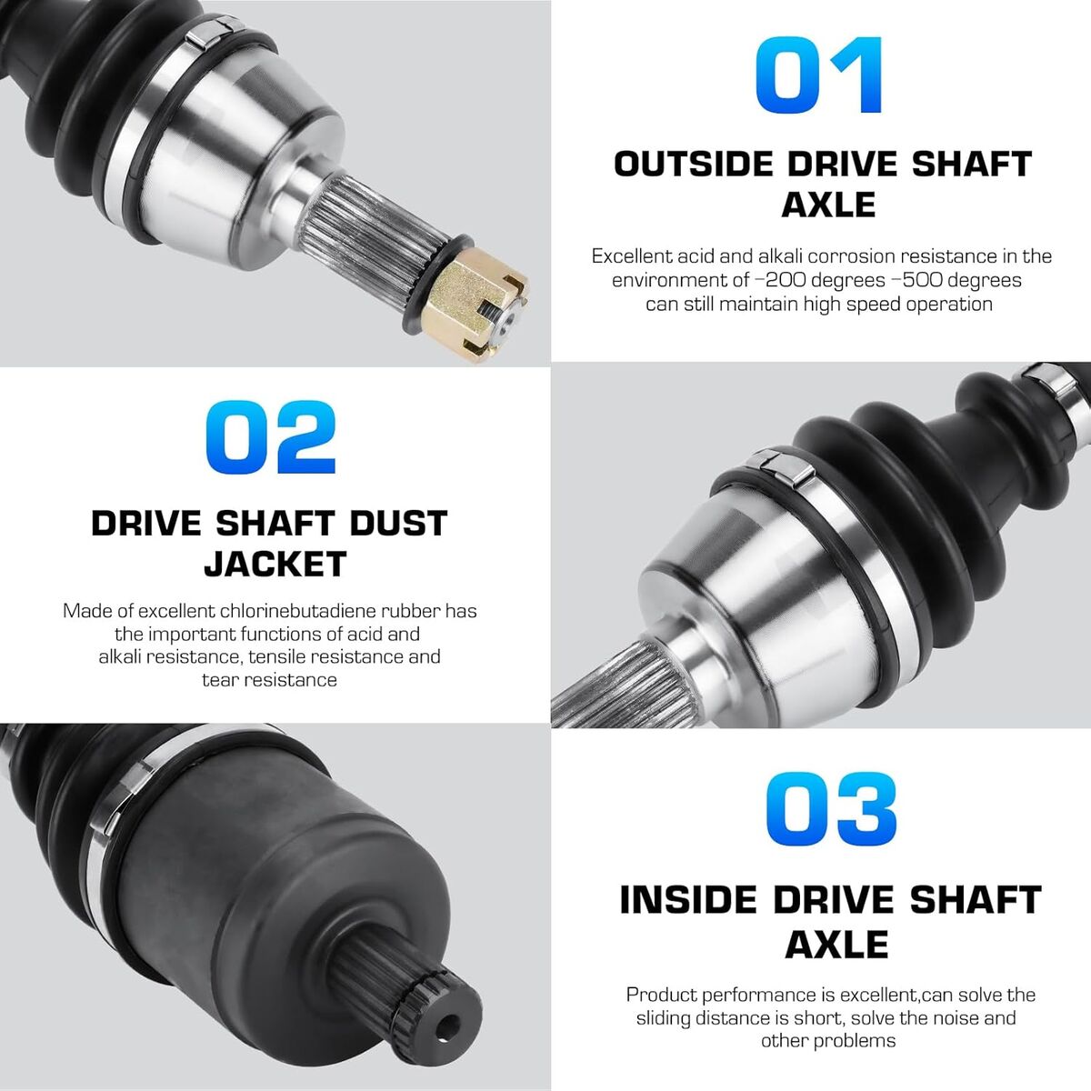 High QualityThis CV Axle shaft is assembled with molybdenum disulfide lithium grease and heavy gauge neoprene puncture resistant boots to increase performance and withstand extreme high and low temperatures.