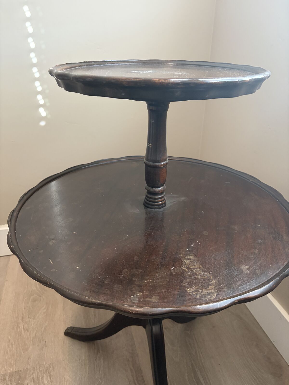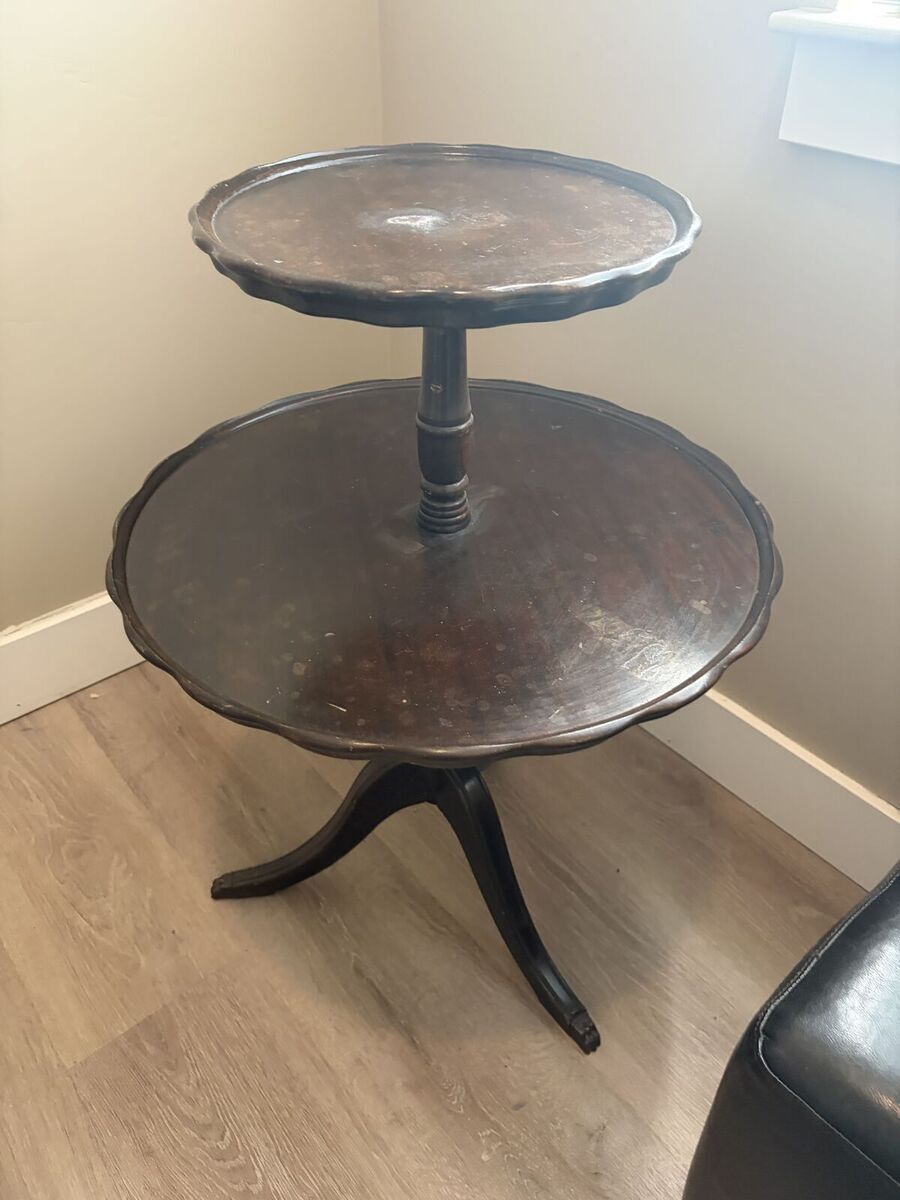 PayPalAntique Mahogany Pie Crust Two-Tier Pedestal Dumbwaiter Table with claw foot Top Tier is 14 in diameter and lower tier is 24 in diameter and top tier is 32.5 high. There is a blemish on the top tier that could be easily restored.