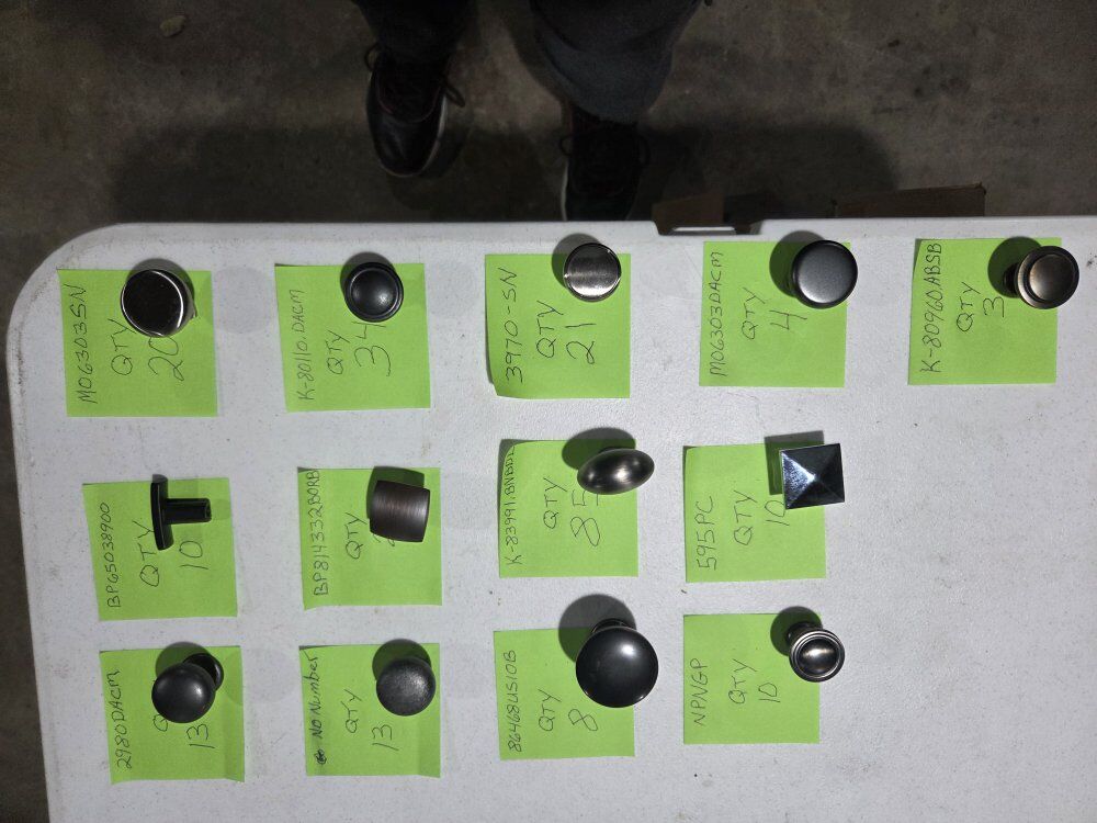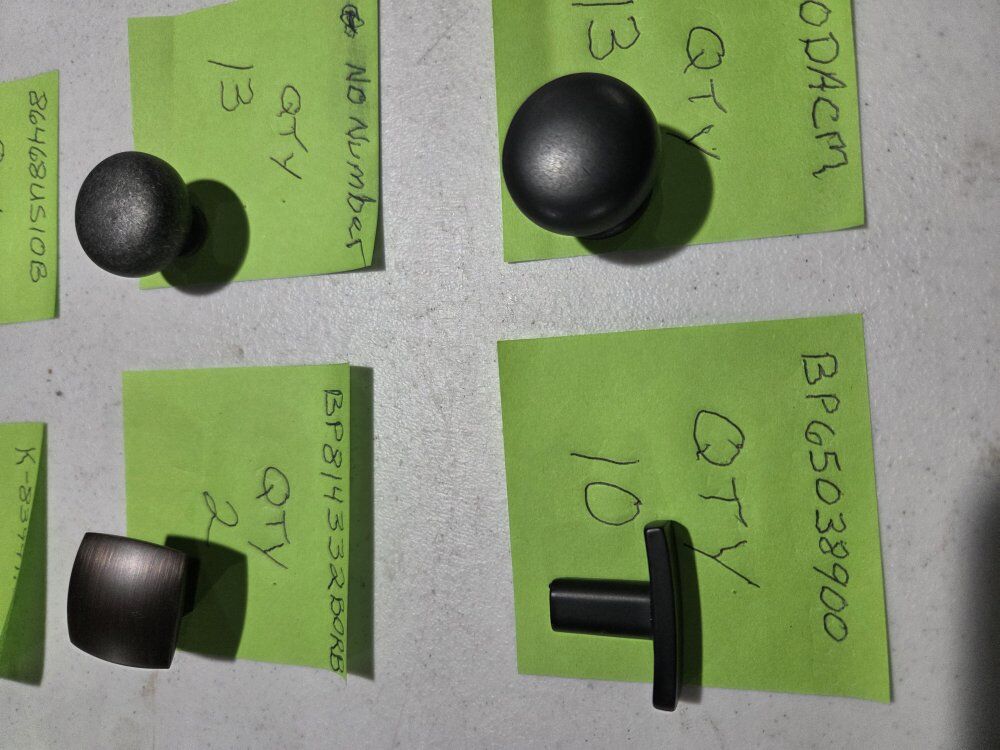VenmoCabinet Hardware. Multiple styles and colors. Each knobe is on a green sticky note. On the top of each sticky note is a knobe number. On the side is a quantity of the knobe that is on that sticky note. You can buy as many as you want as long as the quantity shows I have it. Any questions just ask. Want a better photo of a knobe I'll send it