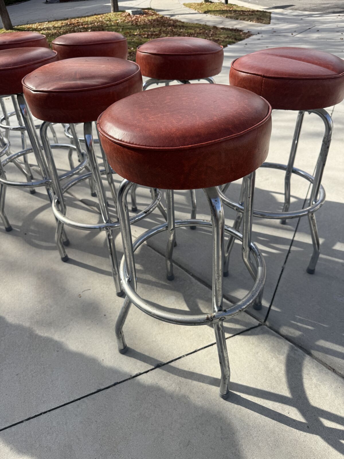 VenmoFive padded restaurant stools with red seats. Solid condition, matching set. 29in tall