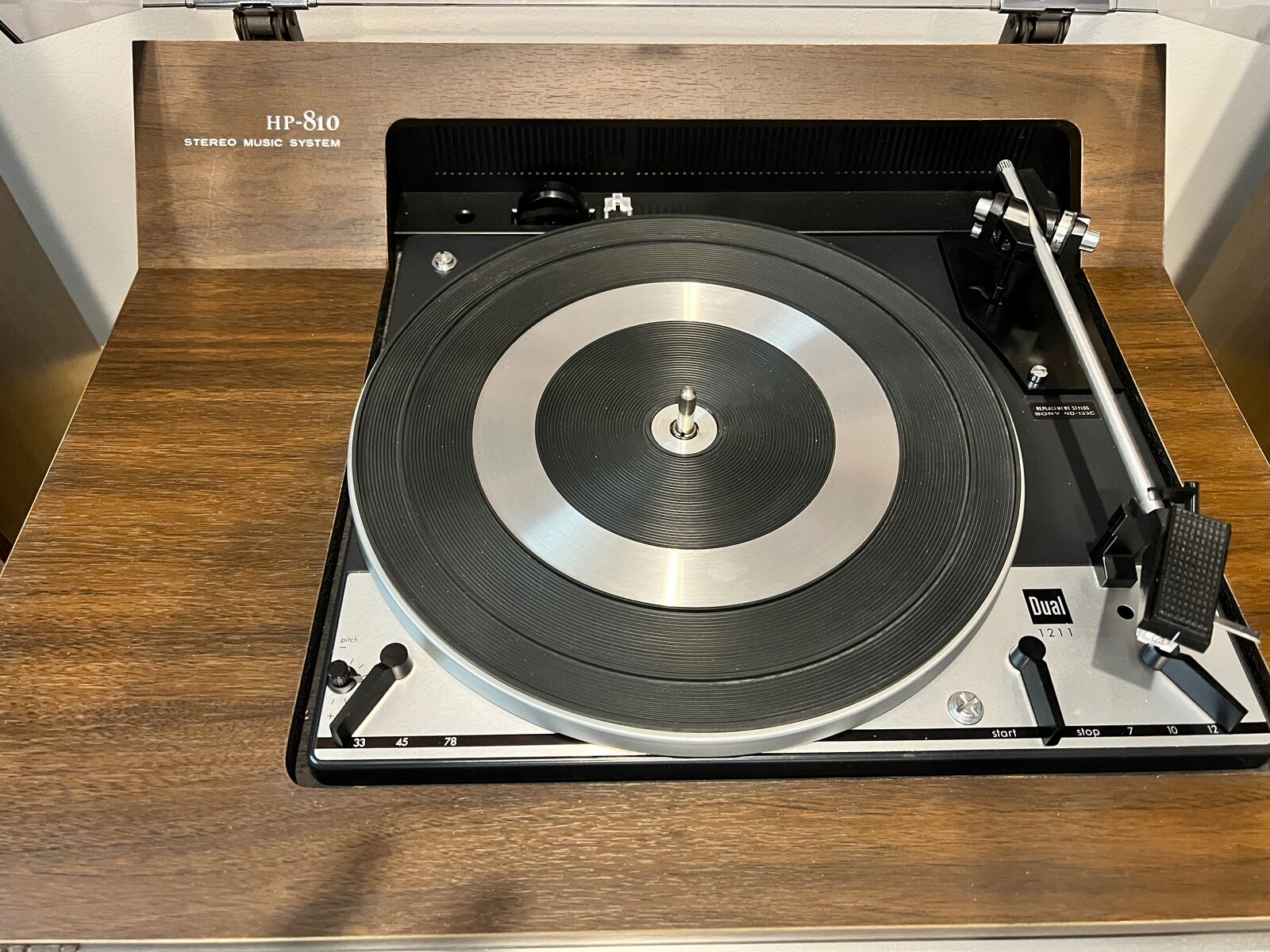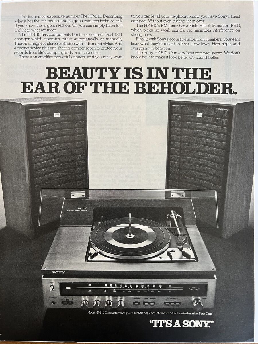 VenmoSony Stereo System HP-810 – Vintage, Complete, Fully-Serviced Sony’s top-of-the-line all-in-one solid-state stereo system from the mid-70s. Fully serviced and fully functional with original SS-810 Sony speakers – great, warm vintage sound. Serviced and restored by Interwest Electronics in Salt Lake City. An incredible mid-century vintage piece that looks good and sounds good. I have invested much more into this than the asking price but need to make room for other vintage pieces in the collection. The built-in turntable is a Dual 1211, auto-on auto-off with a new OEM cartridge and stylus, dampered cueing lever, pitch control, speed selector, record-size selector, 45-rpm adaptor, stylus force dial, tonearm balance adjustment, hinged dust-cover. The built-in amplifier/tuner is 24 watts RMS/continuous power – well matched for the speakers, with hook-ups for two sets of speakers, a tape player, antennas, a ground connection, headphone jack, bass/treble/volume/balance controls. Tuner includes AM/FM and signal meter. Frequency response is 40 Hz – 40 kHz, harmonic distortion < 0.5%. Pleasant blue/green vintage lighting on the display. Speakers are 2-way acoustic-suspension speakers with 8” and 3” cones, 8 ohms, dimensions are 22.5”H x 13”W x 8.5”D. Will include a Bluetooth DAC receiver for streaming. Comes with original Owner’s Manual, Service Manual, speaker cables, and the Sony promotional ad. Sony promotional ad copy: This is our most expensive number: The HP-810. Describing what it has that makes it sound so good requires technical talk. If you know the jargon read on. Or you can simply listen to it, and hear what we mean. The HP-810 has components like the acclaimed Dual 1211 changer which operates either automatically or manually. There’s a magnetic stereo cartridge with a diamond stylus. And a queuing device plus anti-skating compensation to protect your records from life’s bumps, grinds, and scratches. There’s an amplifier powerful enough, so if you really want to, you can let all your neighbors know you have Sony’s finest compact. Without even inviting them over. The HP-810’s FM tuner has a Field Effect Transistor (FET), which picks up weak signals, yet minimizes interference on strong ones. Finally, with Sony’s acoustic-suspension speakers, your ears hear what they’re meant to hear. Low lows, high highs and everything in between. The Sony HP-810. Our very best compact stereo. We don’t know how to make it look better. Or sound better.