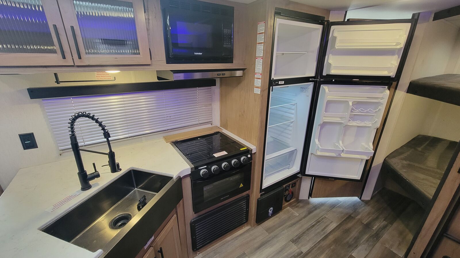 One slideout, furnace, AC, full kitchen, microwave, 2 burner stove, oven, 12v DC fridge and freezer, radio with indoor and outdoor speakers, and much more