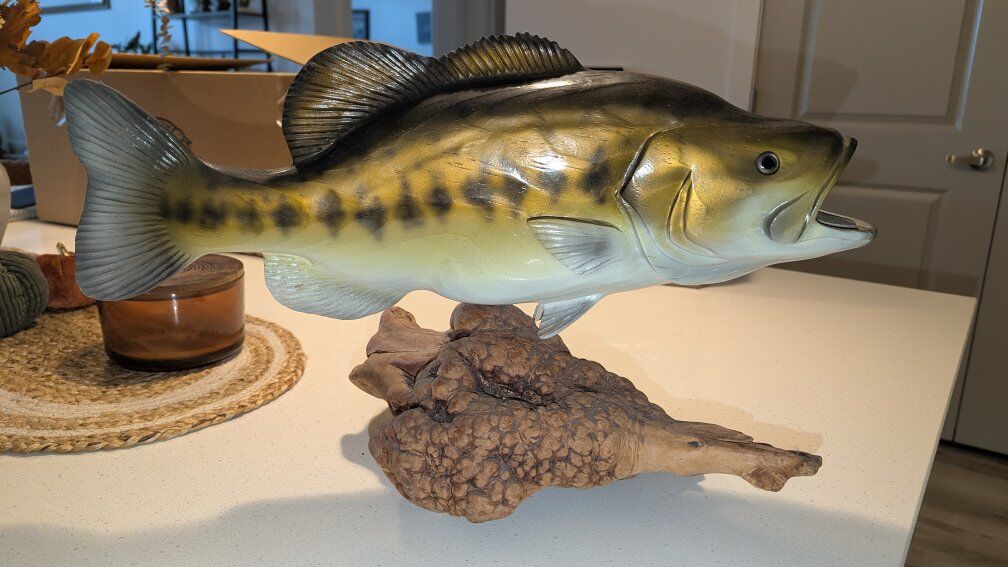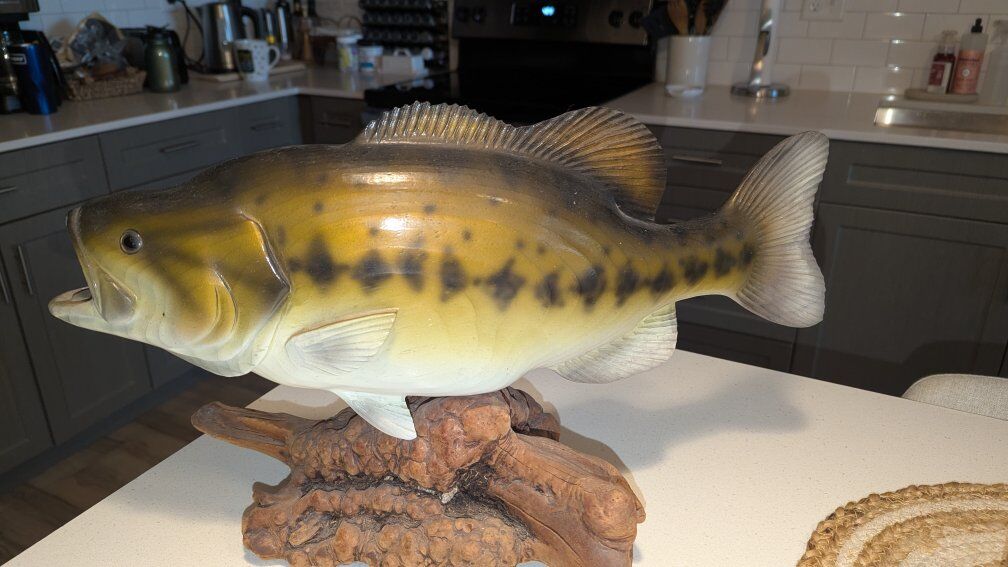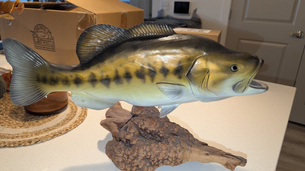 VenmoAn exceptional example of the artistry from Big Sky Carvers. beautiful Hand Carved and Painted Bass on a Burl Wood base. The bass is 20 inches long and the complete piece is 12 inches tall.