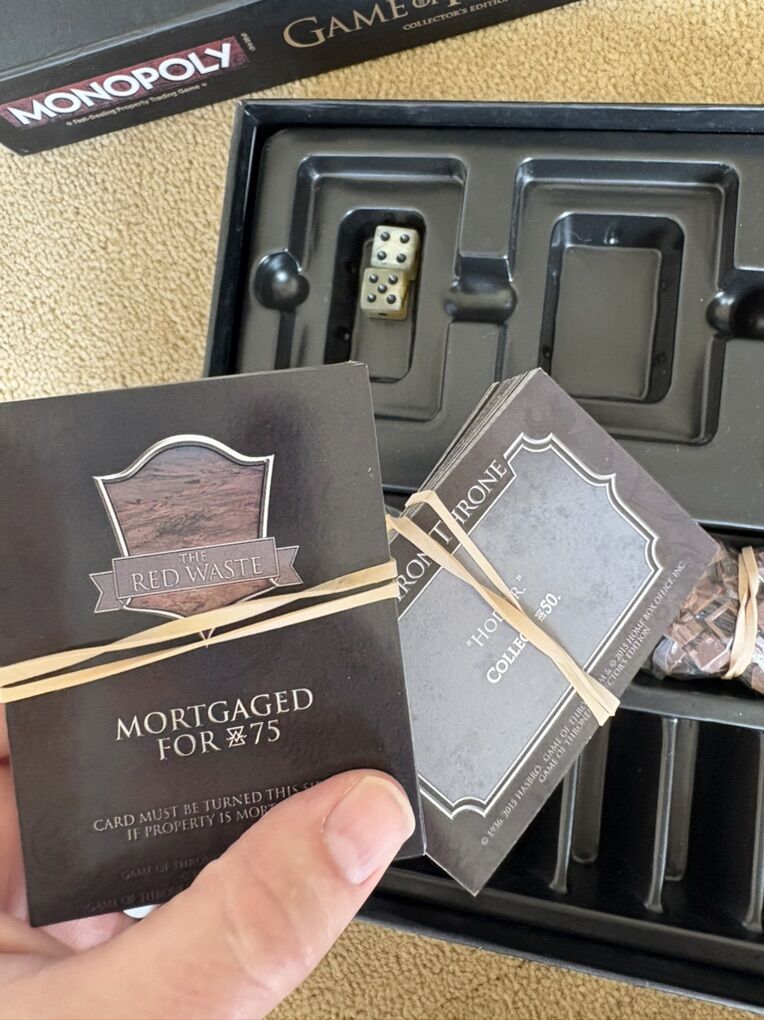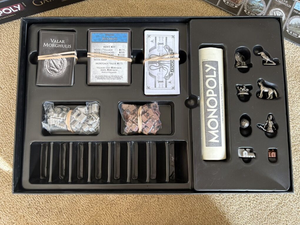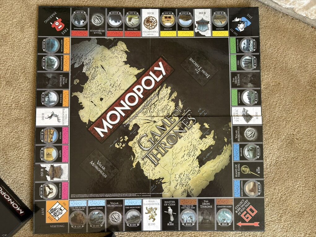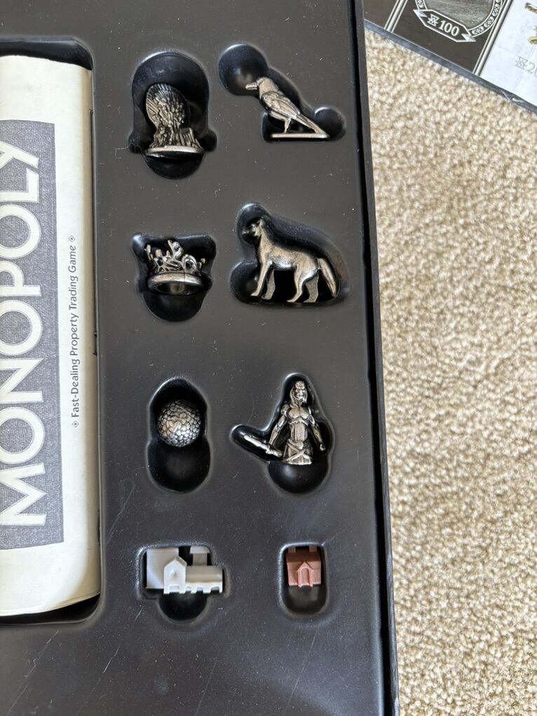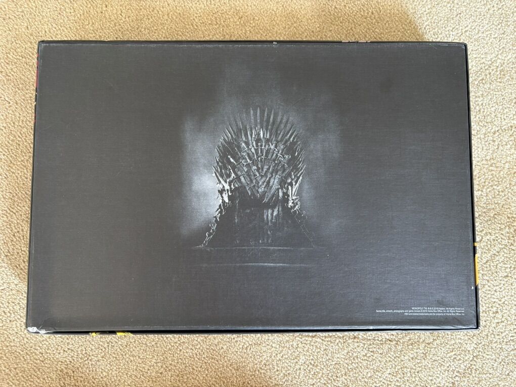 COMPLETE Monopoly: Game of Thrones Collector’s Edition. The fast-dealing property trading game. HBO, Hasbro, 2016. 2-6 players, ages 18+. Complete, no missing pieces. Components in excellent condition. Box slightly damaged (see photos). Text only. Cash or Venmo.