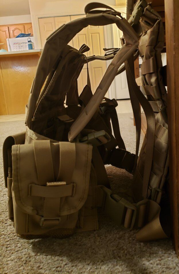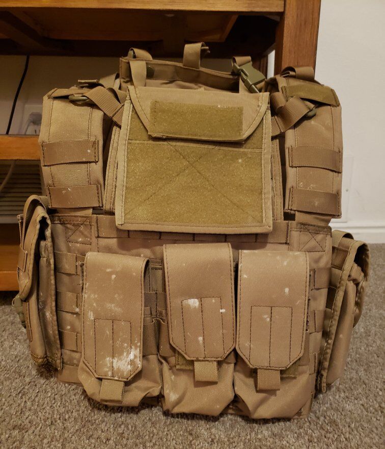 VenmoChest rig used for airsoft and occasionally. 3 mag pouches on front another on rear of rig. One front pouch and two side pockets. Back panel capable of holding water bladder. Not meant for plates.