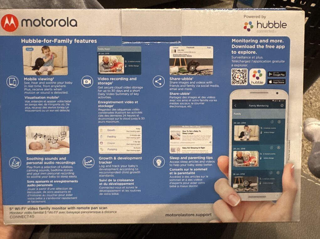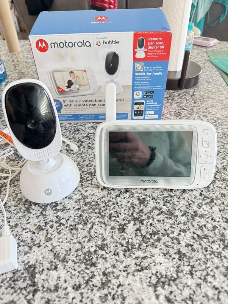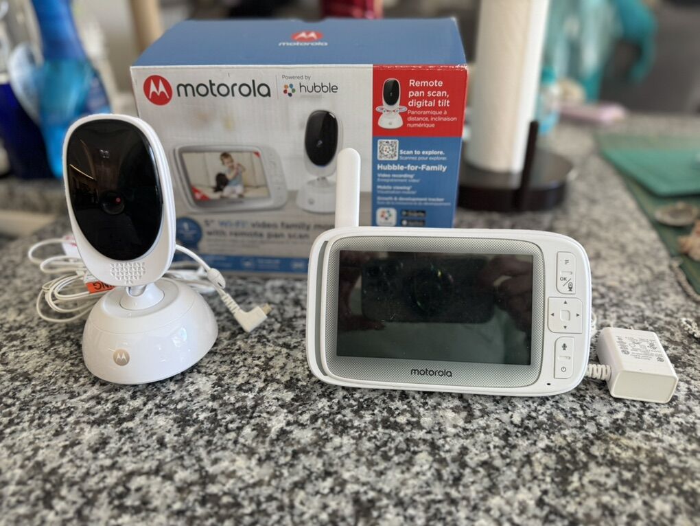 Uses the Hubble app, two way talk communication, room temperature monitoring, works work Alexa and Google assistant, secure connection, infrared night vision, multicolored light mode, In great condition we loved it and loved being able to see our kids when we were away from our phone as well as on the hand held device. only serious buyers. Venmo or cash only.