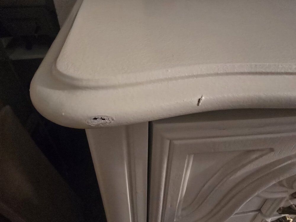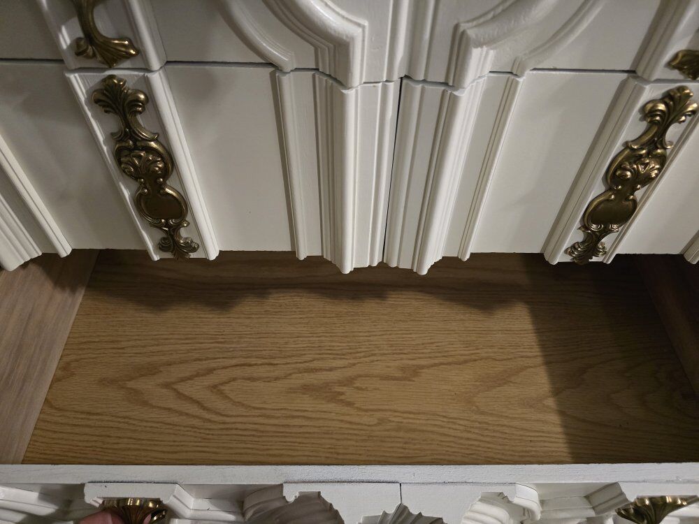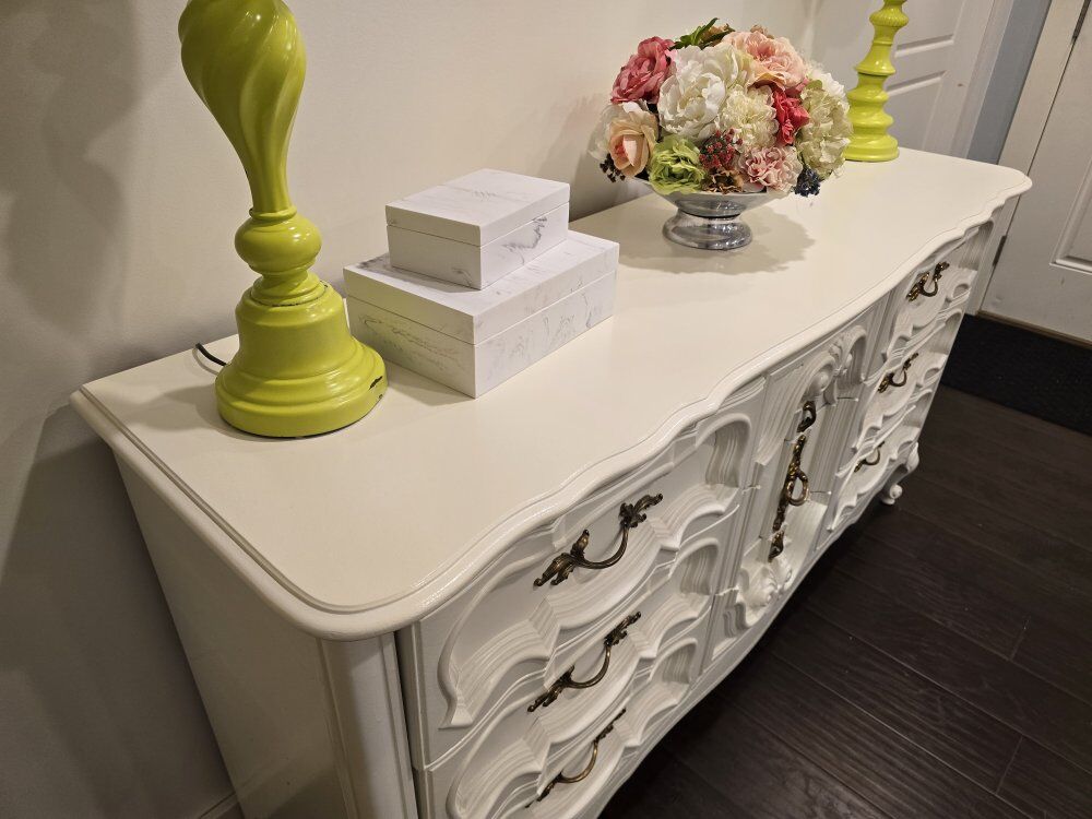 This is a beautiful set of decorative white painted dressers with gold hardware. They are in really good shape, but they aren't perfect. See the pictures. The drawers all slide well. We will take cash or Venmo.