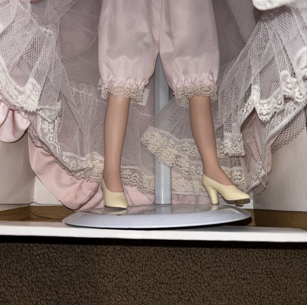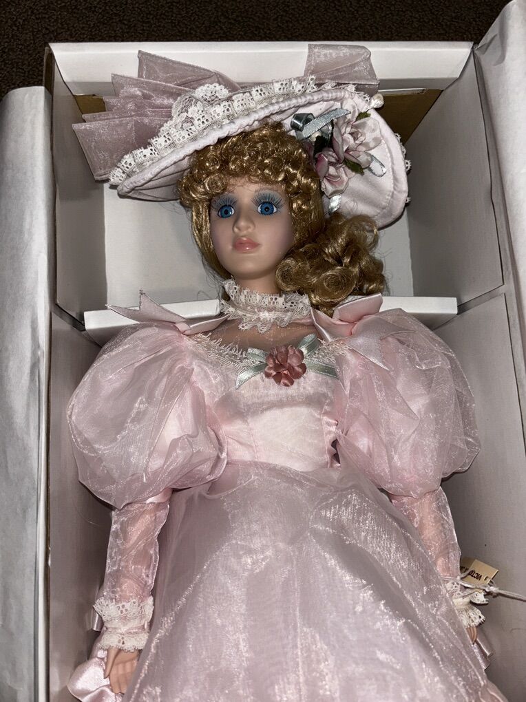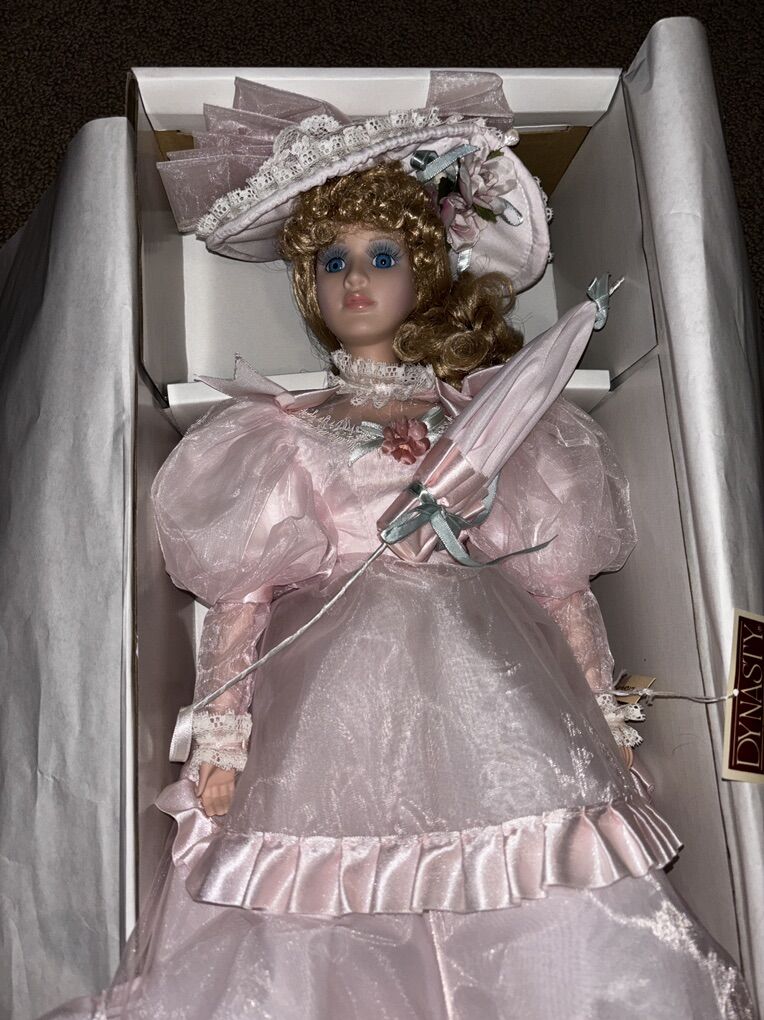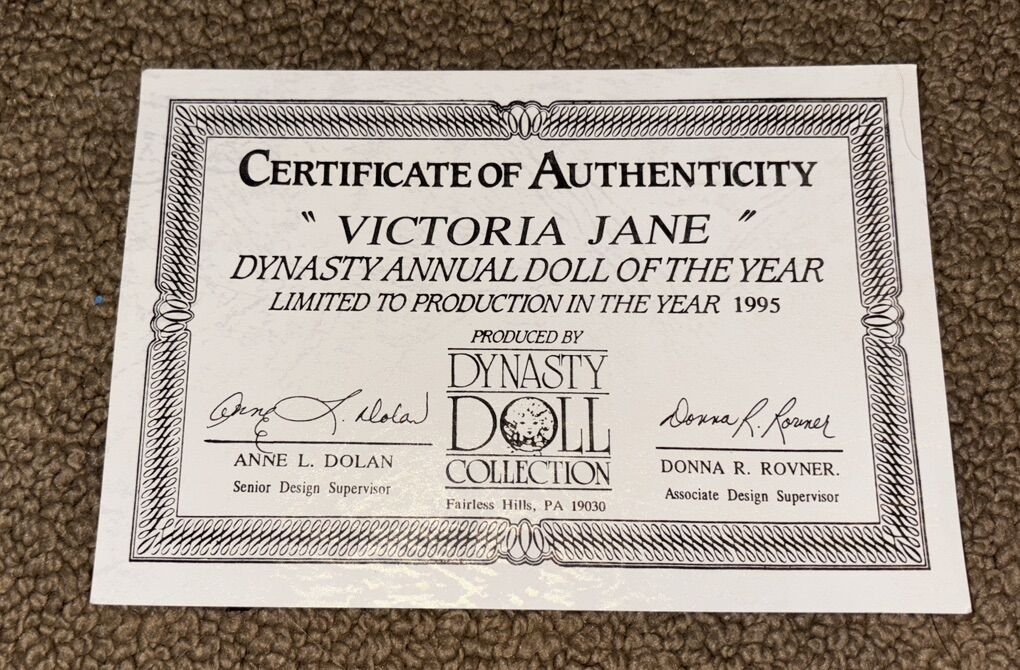 The Dynasty Doll Collection Victoria Jane Doll of the Year 1995 is an 21-inch porcelain doll with curly light brown hair and blue eyes. This original doll from the Dynasty Dolls franchise features a light complexion and is a part of the Doll of the Year product line. Manufactured in Taiwan in 1995, this collectible doll comes with a Certificate of Authenticity and is a must-have for any doll enthusiast or collector. In excellent condition in original box. Cash only Pick up in West Jordan