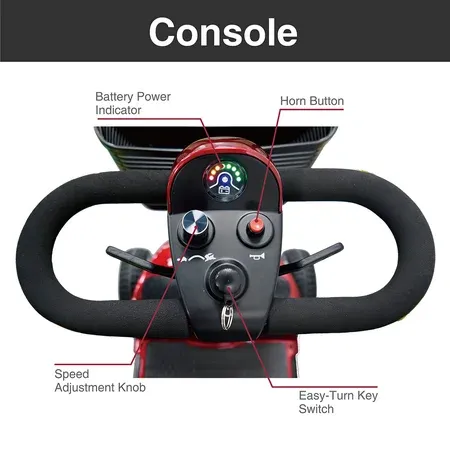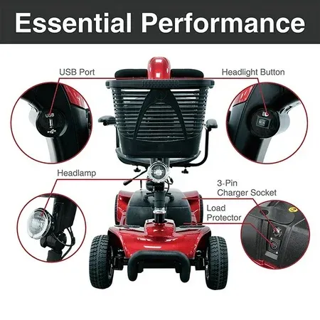 Delta tiller;• Large, plastic carry basket;• Quick and easy disassembly;• Ergonomic throttle control;• Easy freewheel operation;• Height adjustable swivel seat with fold-down backrest;• Easy-to-adjust tiller;• Quick connect batteries;• Flat-free, non-marking tires; • Anti-tip wheels;• Padded and adjustable armrests;• Actual Product Weight: 92 lbs;• Anti Tip Wheels: Yes;• Base Weight: 58 lbs;• Batteries: 2 - 12V 12Ah;• Battery Weight: 20 lbs;• Brakes: Electromagnetic;• Charger: Offboard, 2A;• Climbing Angle: 6 Degrees;• Controller: CTE 45A; • Front Wheels: 8" X 2.5" Flat Free;• Ground Clearance: 2.86";• Heaviest Piece: 40 lb;• Maximum Range: 9 Miles;• Max Speed: 4.25 Mph;• Motor: 24V X 180W X 3400Rpm;• Number Of Wheels: 4;• Overall Product Height: 33"; • Overall Product Length: 40.5";• Overall Product Width: 20";• Primary Product Color: Red;• Primary Product Material: Steel; • Rear Wheels: 8" X 2.5" Flat-free;• Seat Depth: 16";• Seat To Floor Height: 21";• Seat Weight: 11 lbs;• Seat Width: 16.5";• Turning Radius: 53.75"