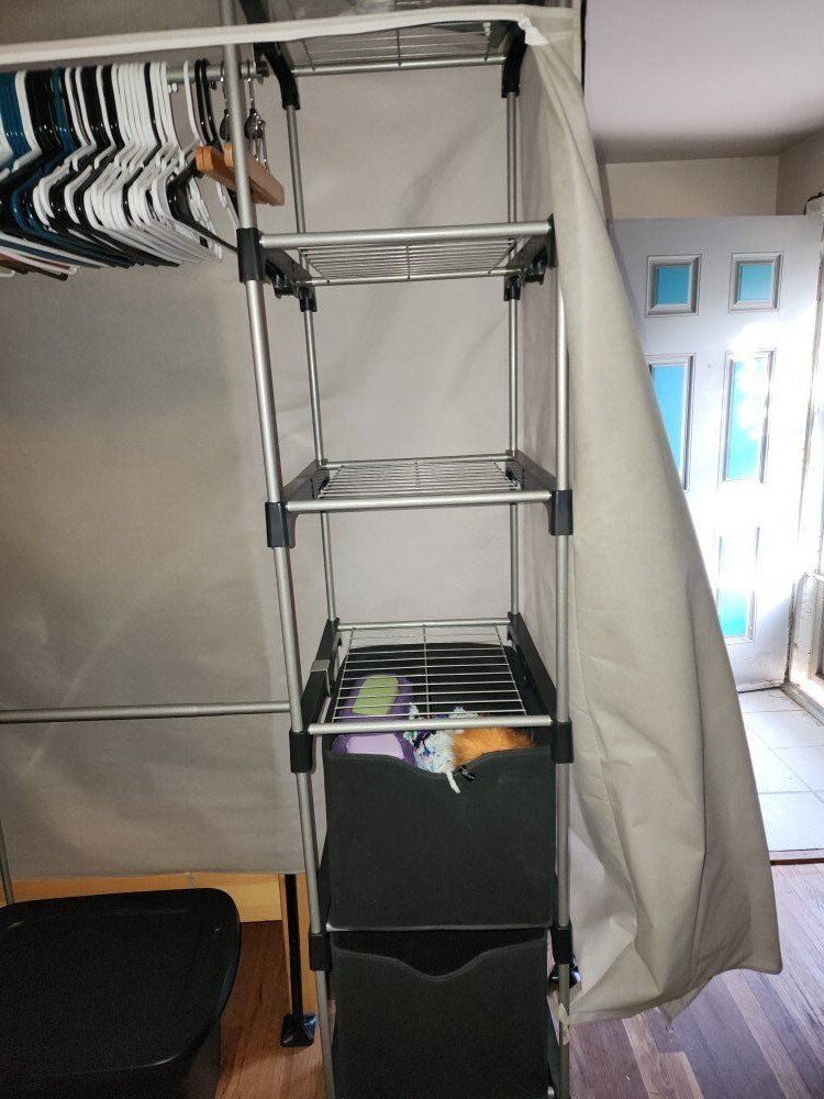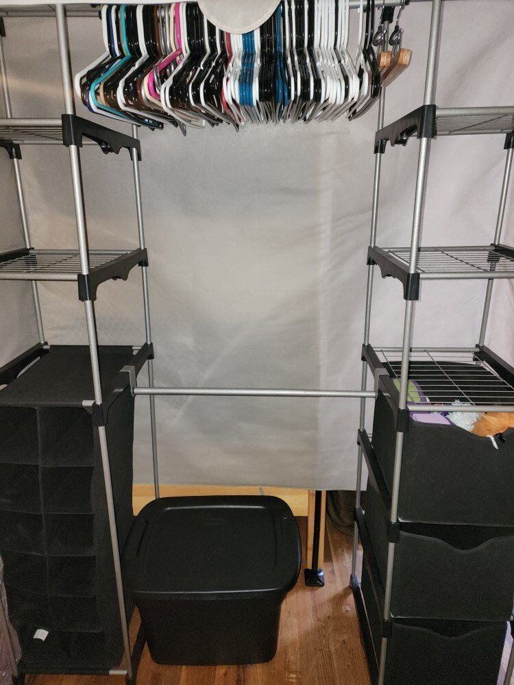 80 inch tall, 20 inch side, 59+ inch long portable closet. (Cover is optional, doesn't even go to the closet) Has been used but not very long. It slides to make a bigger closet space. Has a shoe organizer, 3 cloth drawer organizers, 6 shelves plus the very top. Very sturdy and in amazing condition, no chips or wear and tear or breaks and rips.